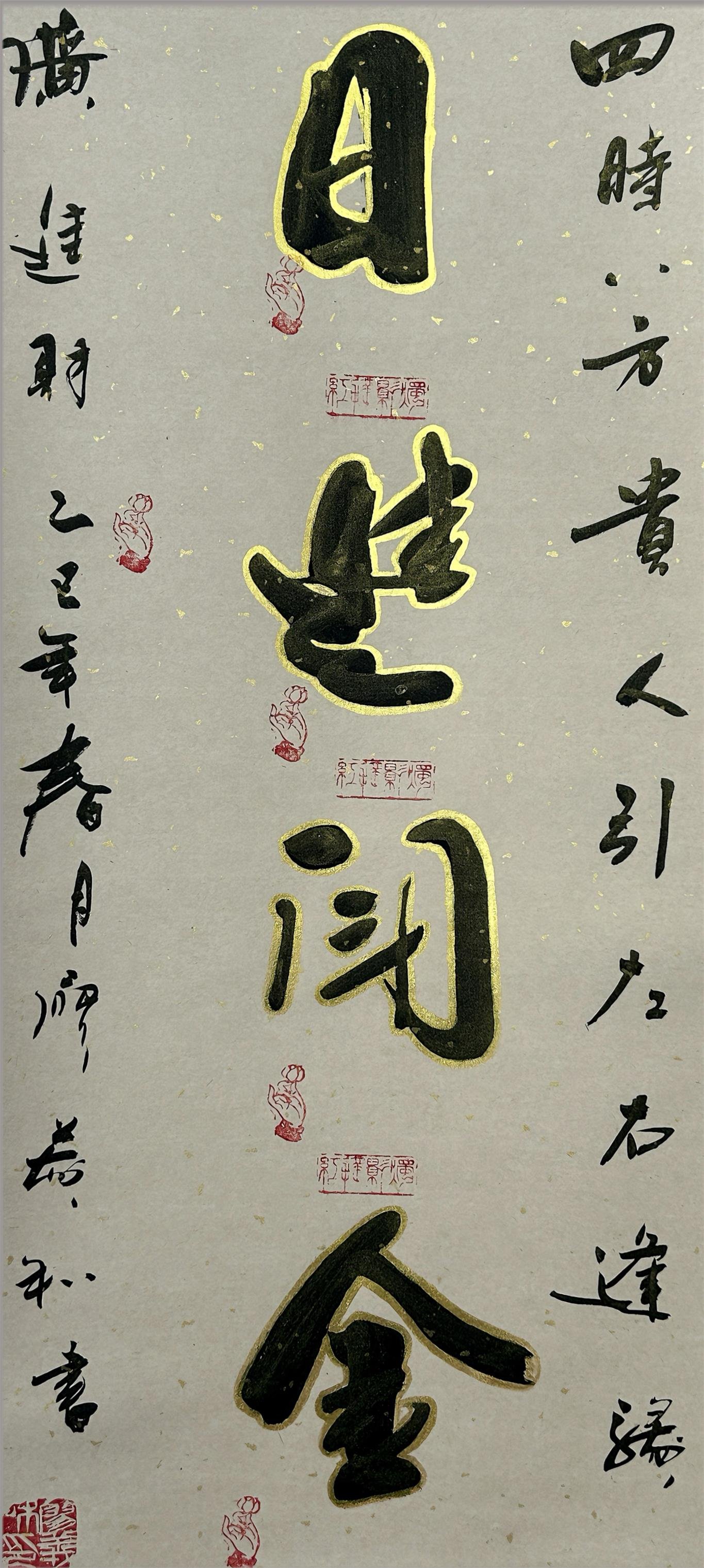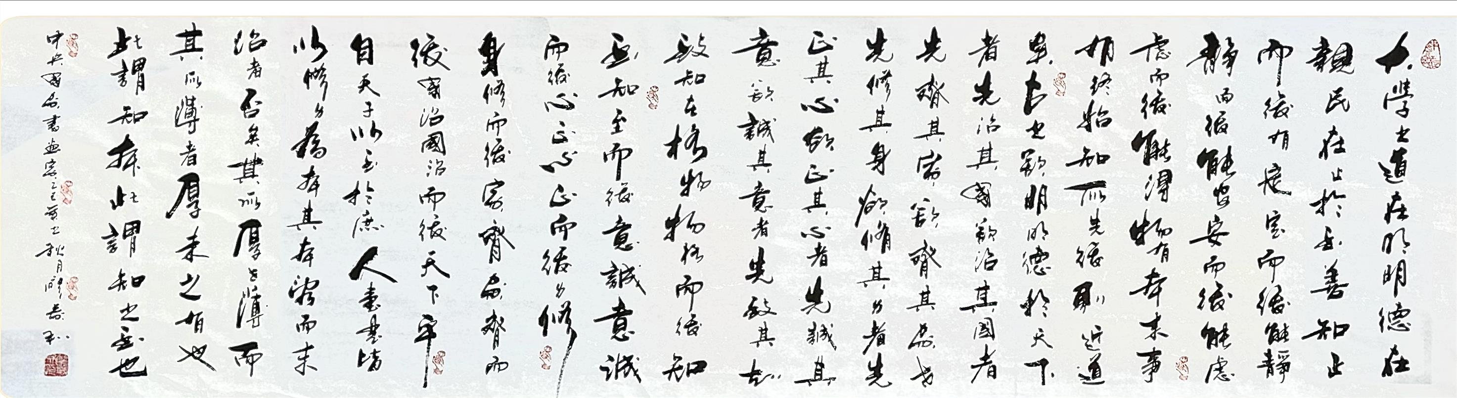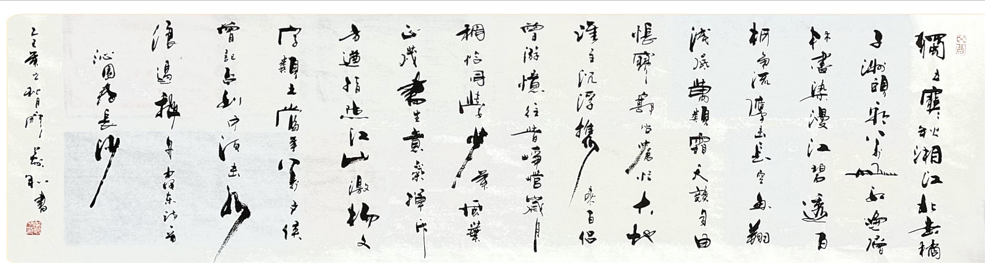 廖义和老师认为,要写好一幅字,要做到首字当先、尾字应齐,句不加点,行笔如风,笔断意连,意在笔先,力到笔尖。要做到收放自如,收要收得密不透风,放要放得跑马射箭。这是廖老师到中年时对字更深的思考,却是在走一条返璞归真的书法之路。这是一种书法的至高境界,也是廖老师毕生的追求。