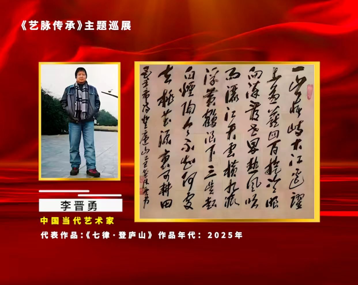现为:国家一级书法家、国家一级美术师、高级书画培训师、中国传统文化促进会会员、中国书画家协会副主席、广元市书法家协会会员,央视<艺术名家>栏目(特聘客座教授)。2024年,被央视授予(中国当代艺术名家)荣誉称号,书法作品《唐、白居易〈望江南〉诗词》入展“第六届中国兰亭书法、兰亭展”,个人简历、作品在〈兰亭书法网〉展示。11月被评为:2004年度中国好品牌影响力十大艺术家、12月被中国美术家协会、中国书法家协会等部门授予(人民书画家)荣誉称号,被中国文化传媒艺术品鉴证备案平台聘为平台<特约艺术家>,2025年1月27日书法、绘画作品在cctv〈艺术中国)春晚展播,3月被〈全国两会重点推荐艺术名家)4月被央视〈艺术名家〉栏目授予〈李晋勇中国当代艺术名家书画工作室)荣誉奖牌,5月被《中国军转民》杂志社荣誉推出李晋勇特别典藏自传作品集,同月被央视书画频道授予(cctv签约艺术家)6月被中华英才杂志社推出个人书法专集,同月作品、简历入编(大国艺象)书画专集,中英文对照、全球发行,并授予由:欧洲艺术节联盟(EFA)主席杨、布里耶和文旅部“一带一路”国际美术工程组织委员会联袂签发的(华人艺术全球影响力人物)称号(荣誉证书)。今年九月,被(中国教育电视台)邀请于2026年1月赴北京参与2026年春晚节目录制,现场书法演示。