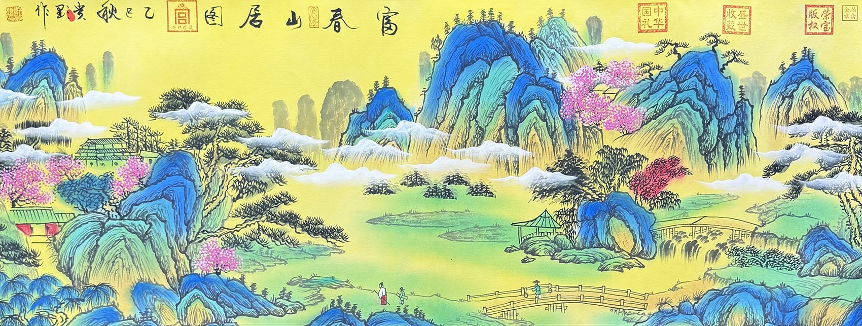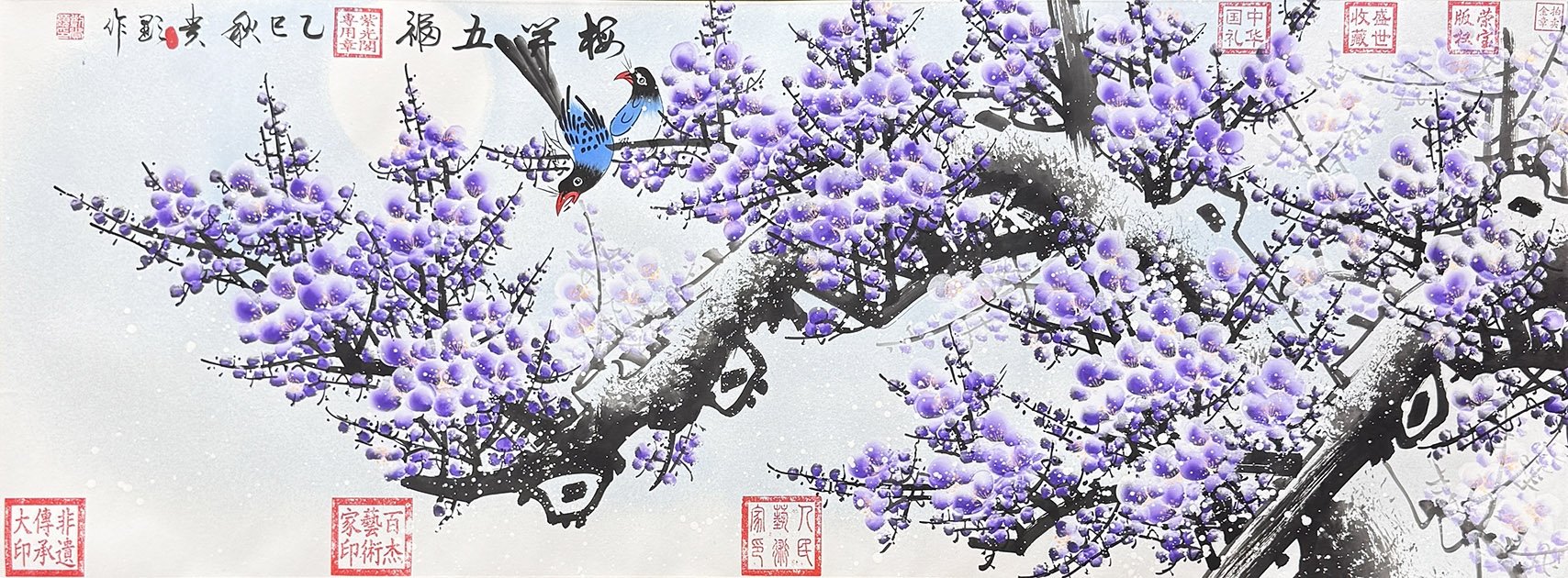 从长期价值来看,其作品兼具“传统底蕴”与“创新特质”:一方面扎根传统书画技法,确保艺术根基的稳定性;另一方面通过题材、形式(如蓝底金墨、专用染料)的创新,赋予作品时代活力,这种“传统与创新并存”的特质,使其作品既符合资深收藏家对“传承性”的要求,也满足年轻收藏群体对“独特性”的追求,未来收藏价值仍有较大提升空间。