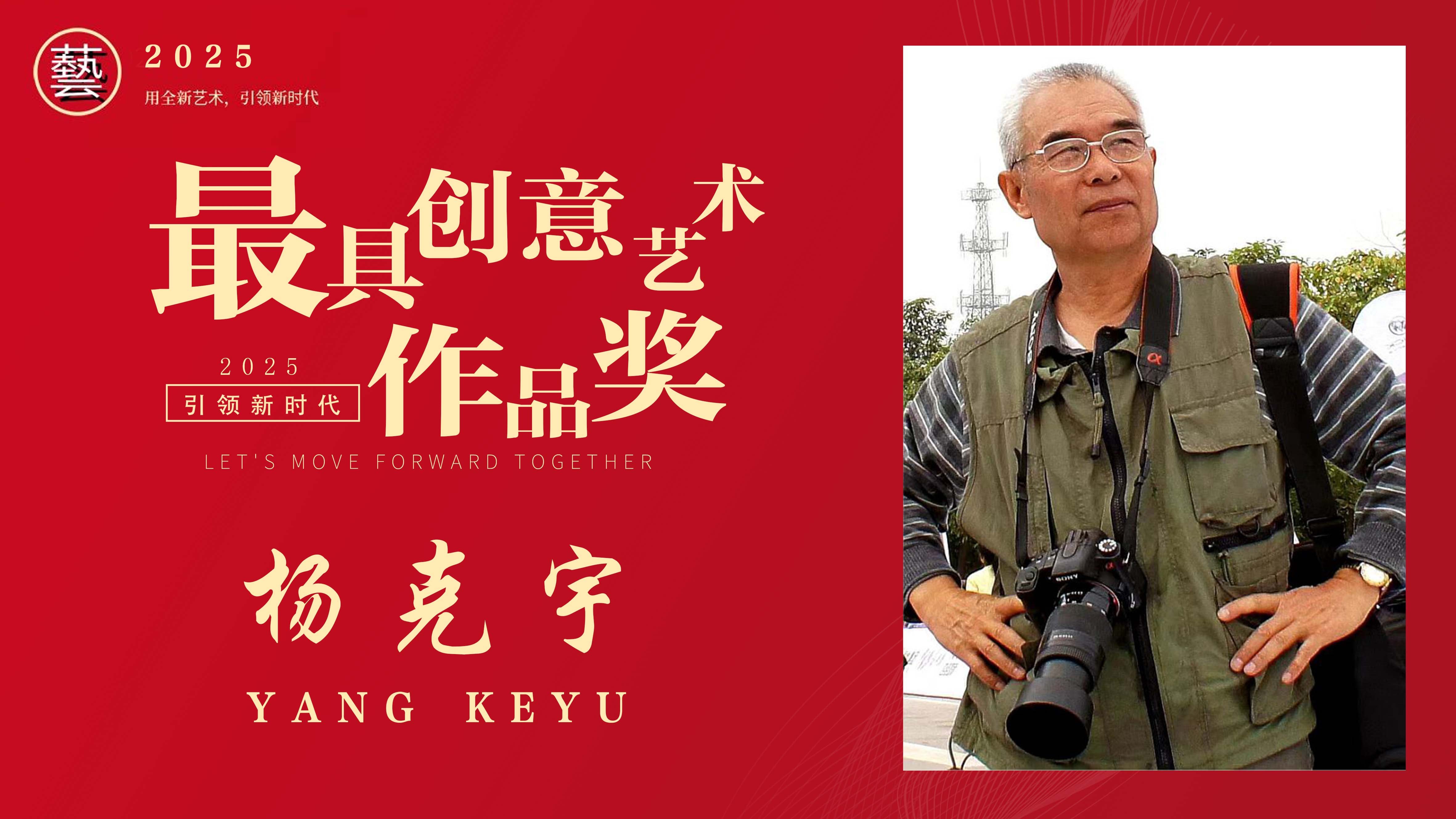 杨克宇,1946年11月出生,安徽颍上人,大专文化。戎马十一载曾三次荣立三等功。现为中国民俗摄影协会会员、中国艺术摄影协会会员、港深珠澳摄影联盟会士、四川省摄影家协会会员、四川省艺术摄影协会会员、绵阳市摄影家协会会员、梓潼县摄影协会原名誉会长,中国珍藏级艺术家,世界杰出华人艺术家。三千多幅作品在全国、省、市多家媒体刊登出版发表,三百多幅作品在全国、省、市影展比赛中入选获奖。个人出版国内邮册两部国际邮册4部个人作品集3部(絲绸作品集一部,時代人物作品集一部与国同心作品集一部)。中国珍藏级艺术家、文艺精神弘扬者、全国文化艺术模范人物。
