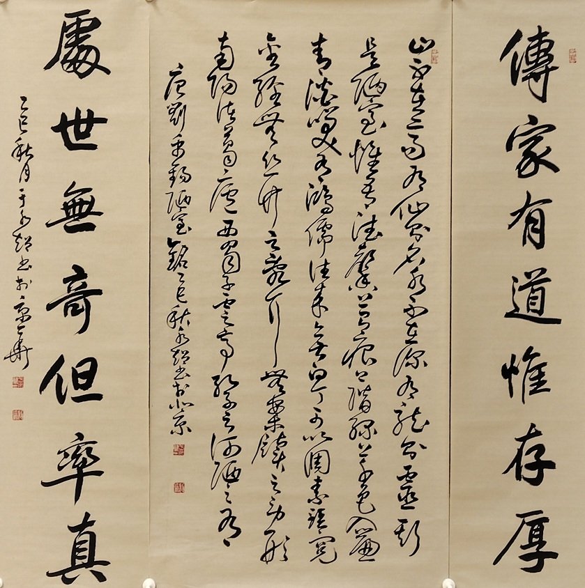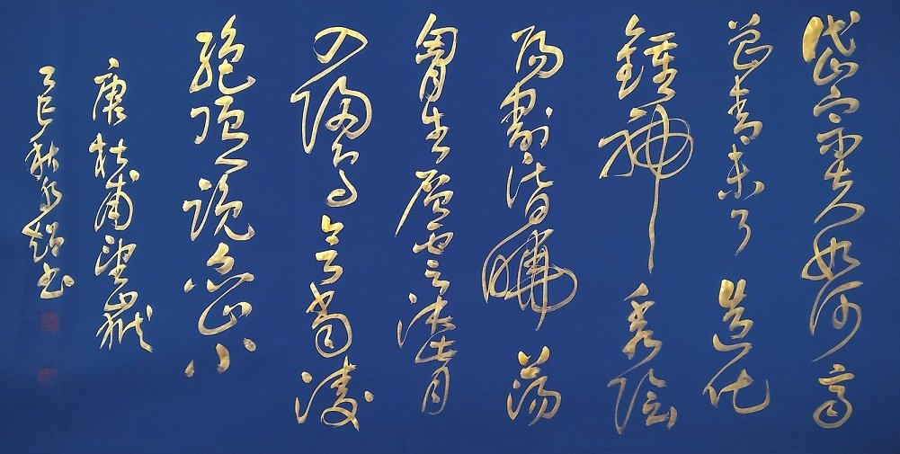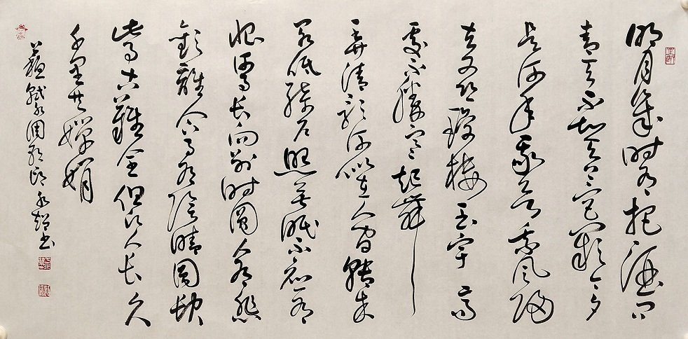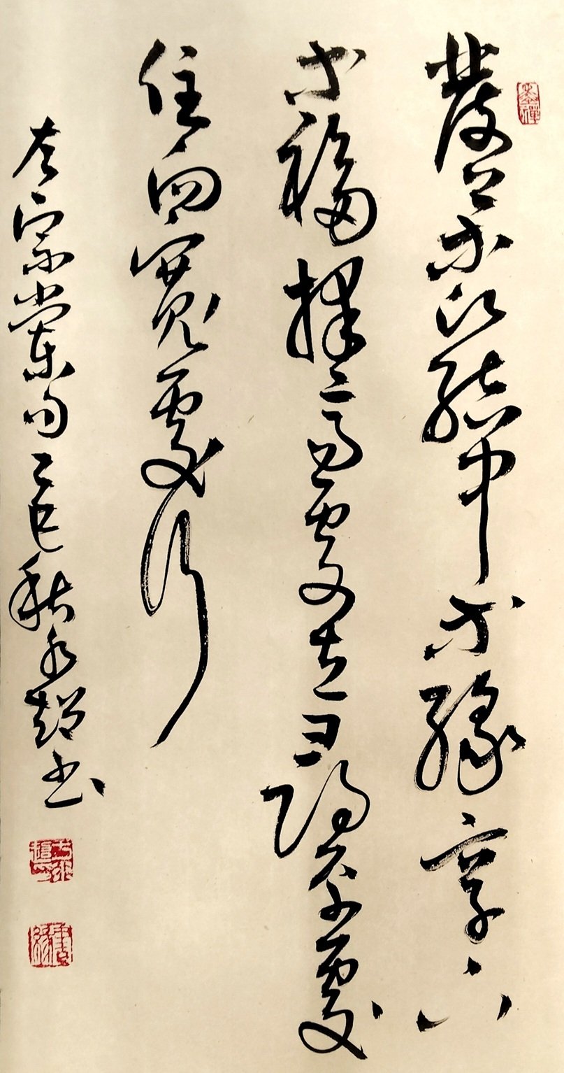 中年拜草书大家李逸野先生为师,日日研习小篆和大草,跨越魏晋直追秦汉,乐此不疲,达到如痴如迷程度,十年磨砺。大草从草圣张芝冠军帖为伴,深研“一笔书”高难度之书法精髓,活用几经失传的“篆籀笔法”入草法,将其发挥到极致,勤学苦练形成肌肉记忆,化古为今,化古归我,逐渐形成了自己的面貌。