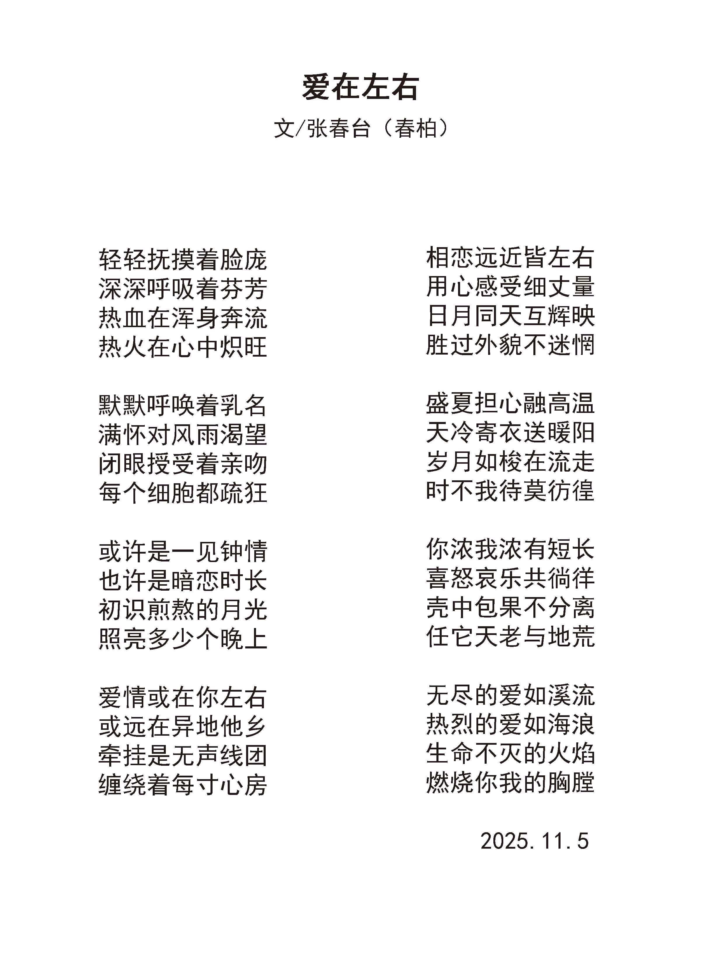 张春台(春柏),诗人,中华诗词学会会员,世界华人音乐家协会会员。NZ国学诗词艺术协会及新西兰文联会员。毕业于湖北大学中文系。获2022年"当代诗人奖"诗词评选大奖特等奖。其代表诗作艺术获2025年网络评选一等奖。