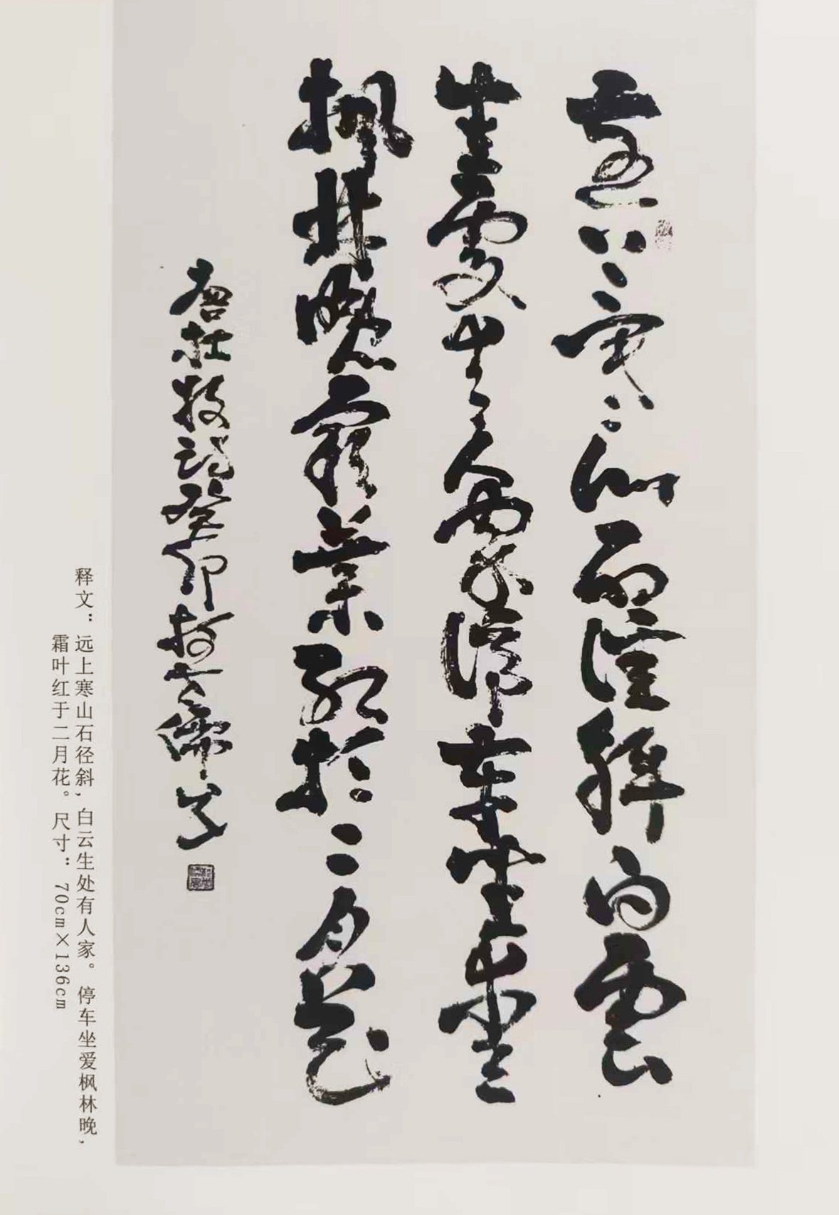 柯世儒的书法起点,是对古人的虔诚“追摹”。他深谙“学书先立形,形立而神生”的理路,早年浸淫于张旭、怀素的狂草帖中,从《古诗四帖》的颠逸、《自叙帖》的奔涌里捕捉笔法的韵律。但他的“摹”从非刻板的复制:观其书写杜牧《山行》的作品,“远上寒山石径斜”的笔画既留存着怀素的使转圆劲,又将线条加粗加厚,以“墨色丰厚”破帖学的纤巧,让“停车坐爱枫林晚”的沉郁心境,随浓淡变化的墨块透纸而出。