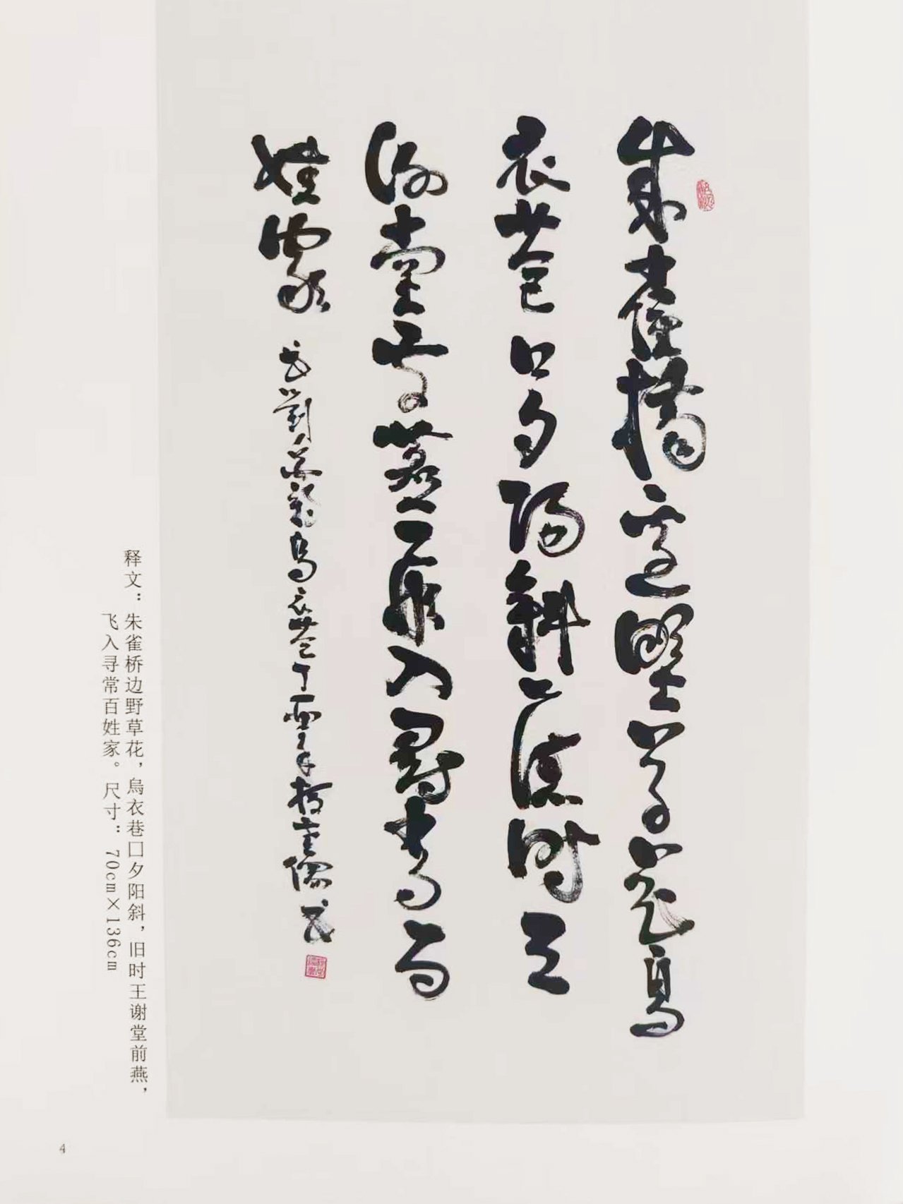 这种“形神兼追”的自觉,让他跳出了“书奴”的窠臼。在书写《乌衣巷》时,“旧时王谢堂前燕”的结体取法王羲之的欹侧,却以“布局开张”打破晋人的内敛——字与字之间牵丝映带如流云绕树,行与行之间疏密错落似山涧叠石,既守着“章法井然”的传统底线,又透着“别有韵致”的现代审美。正如他所言:“学古人不但重其形,更重其神韵与内容”,这份清醒,让他的笔墨始终站在“传承”的根基上生长,而非悬空的“创新”。