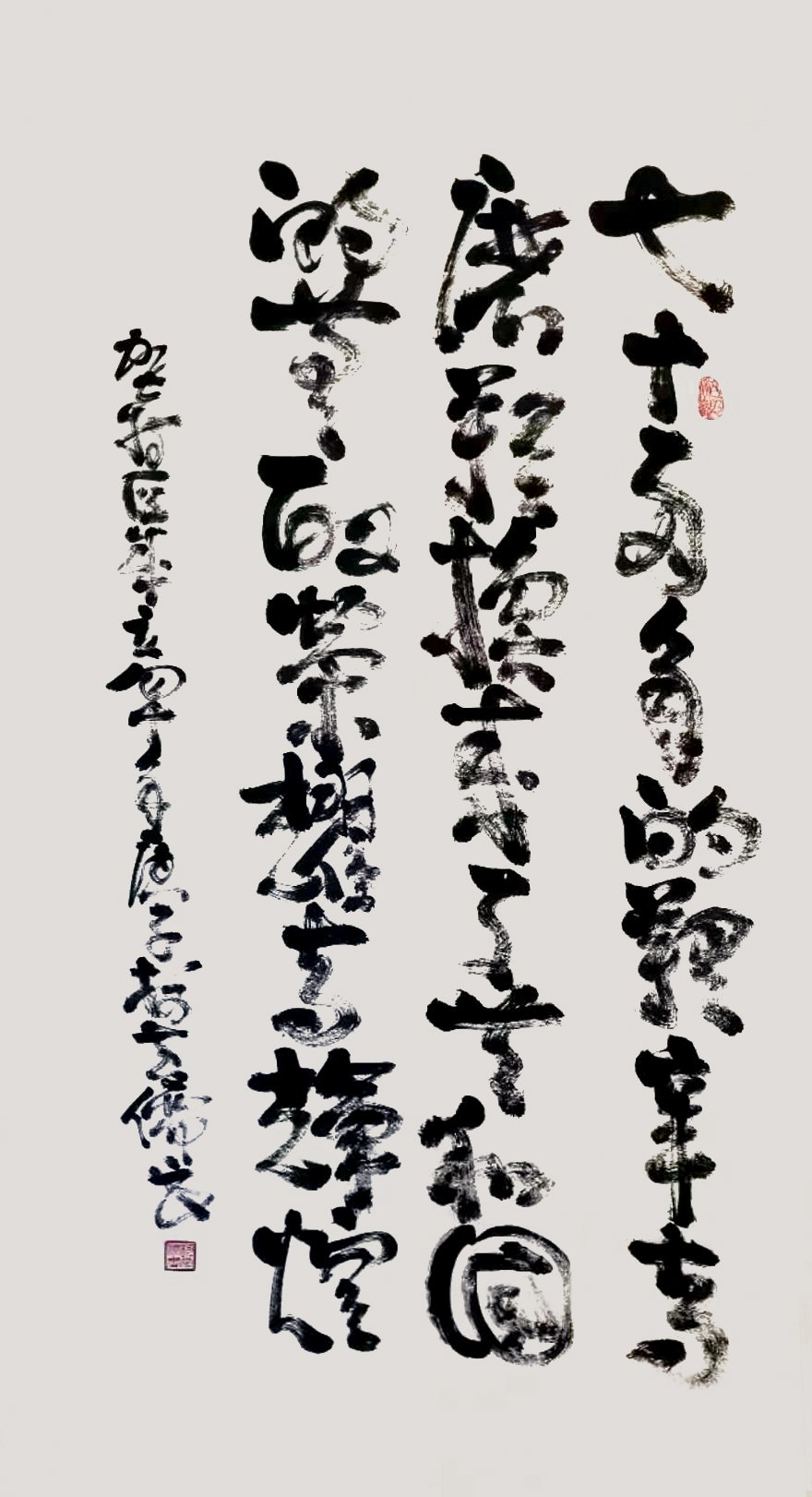 这种化境,是几十年“笔墨修行”的结果:他以传统为基,让书法有了“根”;以时代为壤,让作品有了“场”;以心性为魂,让艺术有了“灵”。他的书法告诉我们:传统不是束缚创新的“枷锁”,而是滋养创新的“土壤”;当代也不是割裂传统的“利刃”,而是激活传统的“活水”——唯有让墨脉通古今,笔意贯山河,书法才能在时代的浪潮中,既守住根本,又焕发新生。