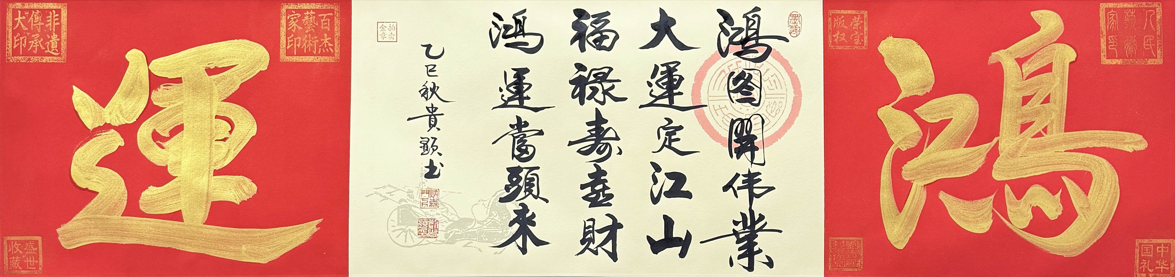 - 代表作《沁园春·雪》以“蓝底金墨”创新形式创作,不仅被列入收藏家资料库、多次亮相拍卖现场,还成为荣宝斋签约出售版权的作品,目前长期悬挂于荣宝斋一楼,成为展示当代书画实力的重要窗口,他也凭此作品获评“当代百杰书画家”荣誉称号。