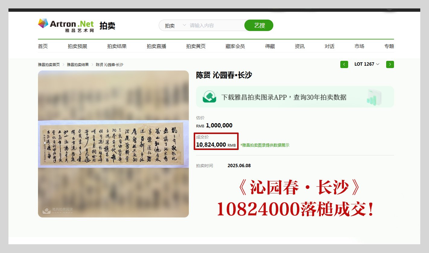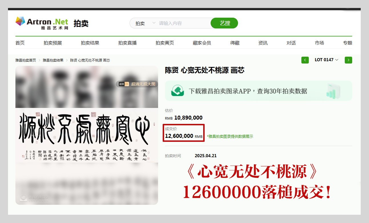 艺术市场的表现同样印证着陈贤作品的分量与价值:2014年,其经典作品《陋室铭》在嘉德春拍中,以345.5万元成交,随后被中国国家博物馆收藏,成为当年书法拍卖领域的焦点;2025年,行书力作《将进酒》凭借精湛笔法与深厚文化底蕴,以1082.4万元高价落槌,最终被清华大学美术馆纳入馆藏,再次刷新其个人作品拍卖纪录。此外,他的多件作品线上线下曝光率累计超百万次,拍卖金额屡破千万,稳定的市场表现与高收藏热度,让他的作品成为当代书法收藏领域公认的“硬通货”,也为传统书法艺术的市场价值树立了标杆。