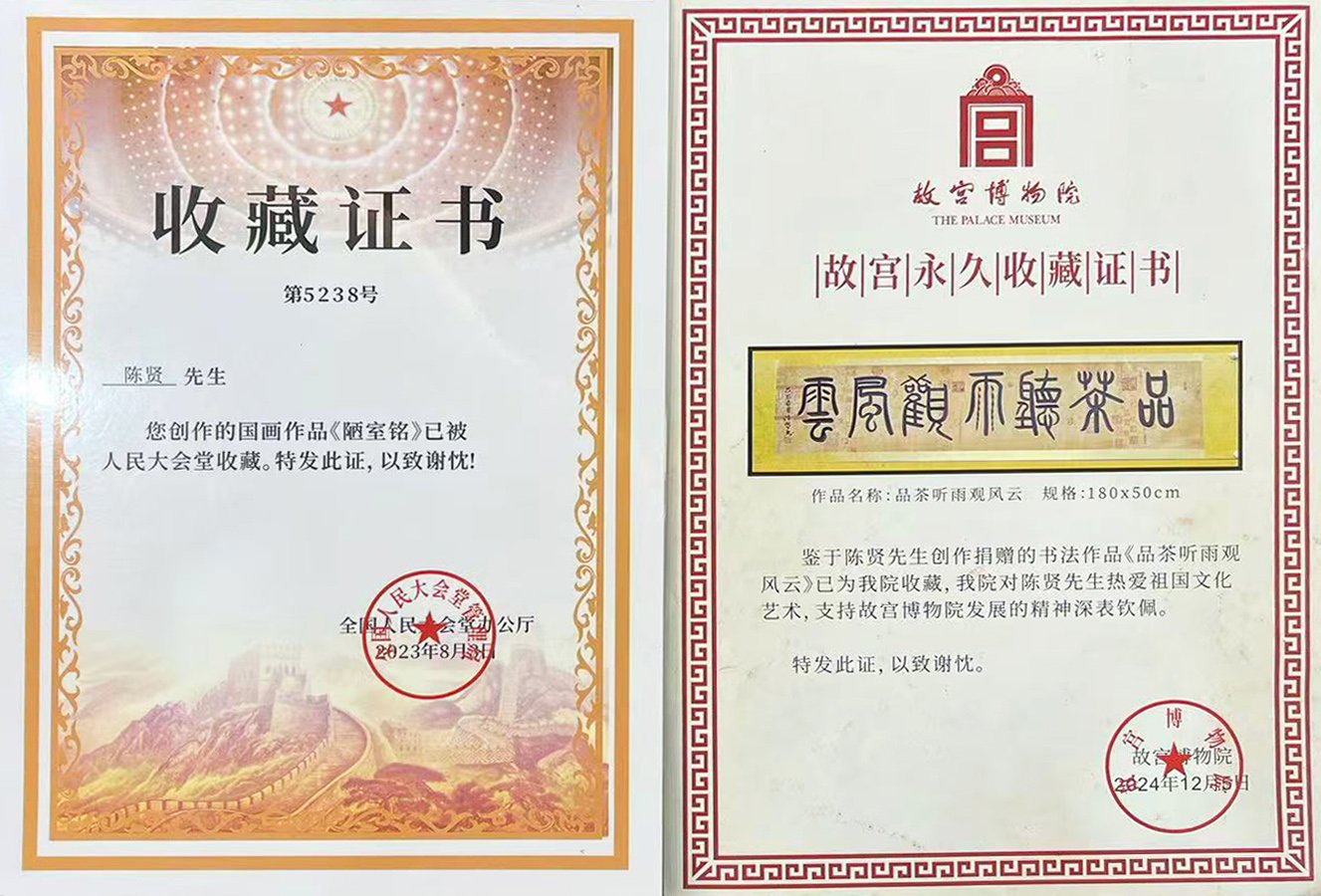 在艺术成就的彰显上,陈贤的作品屡获认可:先后在五百余次国家级、国际性及全国性展览中入选,且多次斩获重要奖项;其作品更跨越国界,赴日本、韩国、新加坡、巴西、加拿大、美国、法国、德国、英国等国家,以及中国台湾、香港、澳门地区展出交流,让中华传统书画艺术的魅力远播海外。与此同时,他的艺术实践亦为中国古文字研究注入活力,其创作中蕴含的文化内涵,兼具历史厚度与时代价值,引得各类美术专业刊物竞相推出专题报道,众多美术评论家亦对其艺术造诣给予高度评价。
