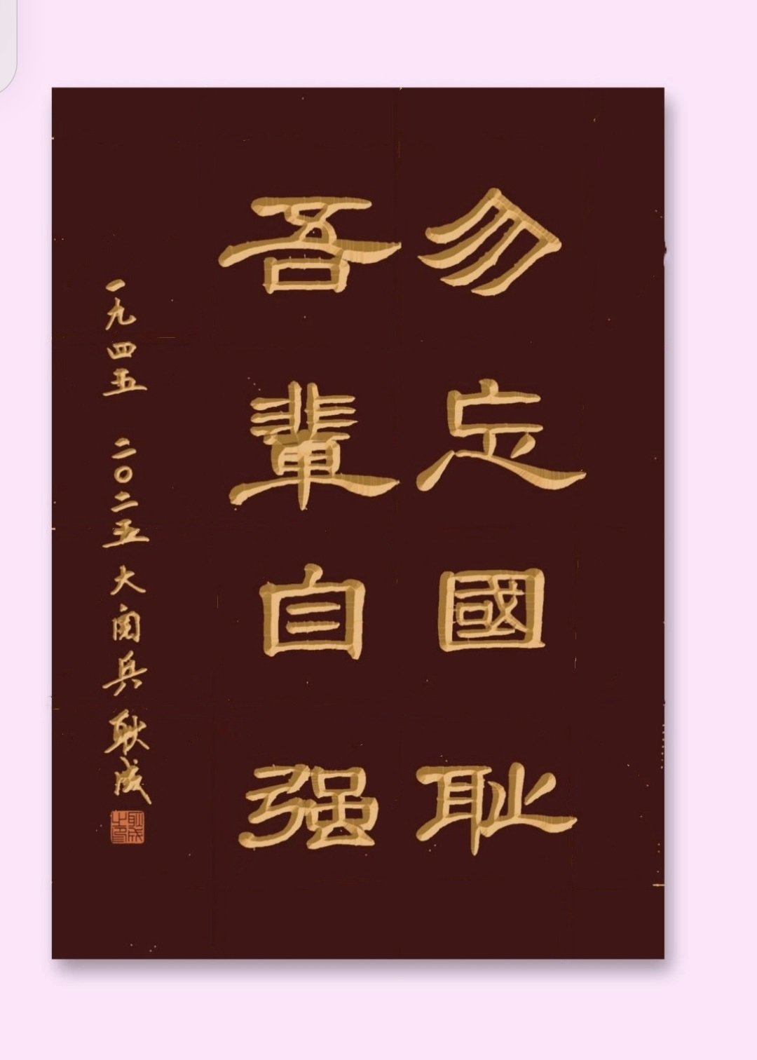 2025年9月,被 中国百强书画家组委会 评为 《中国百强书画家》,颁发了(中国百强书画家)荣誉证书。