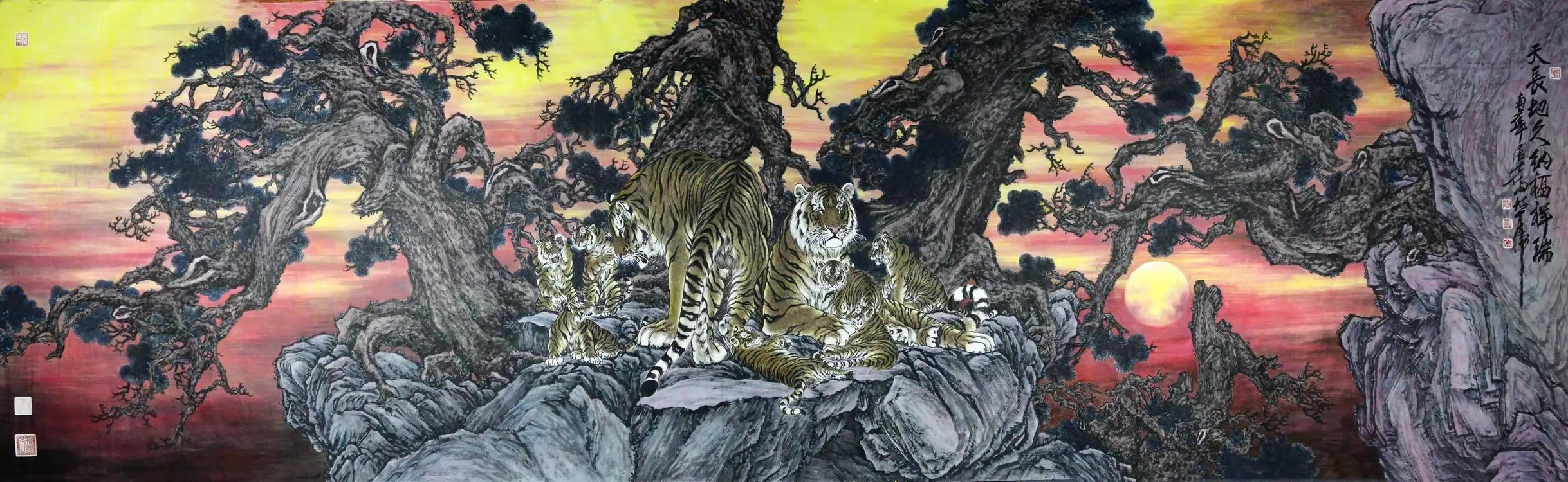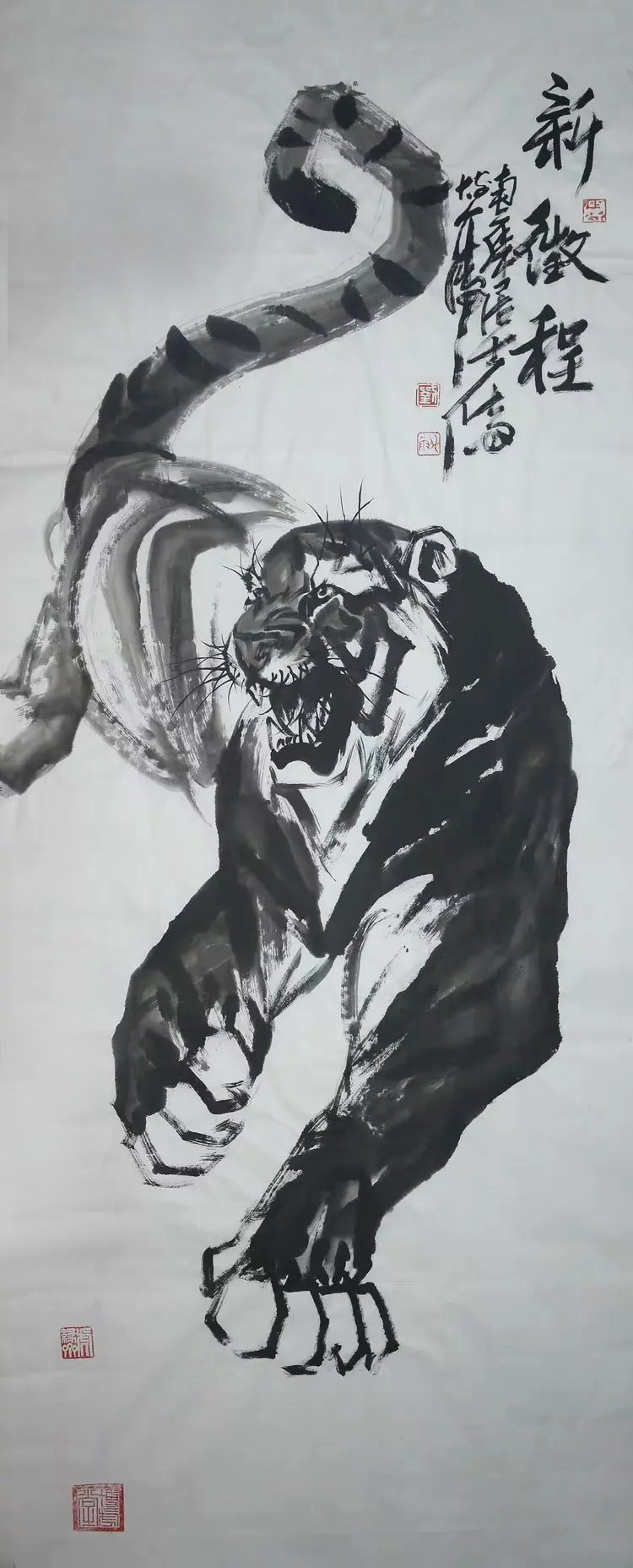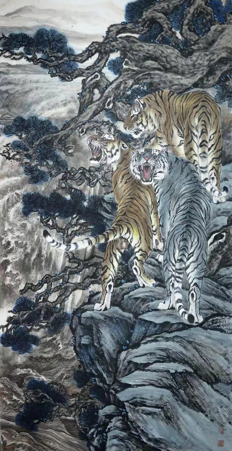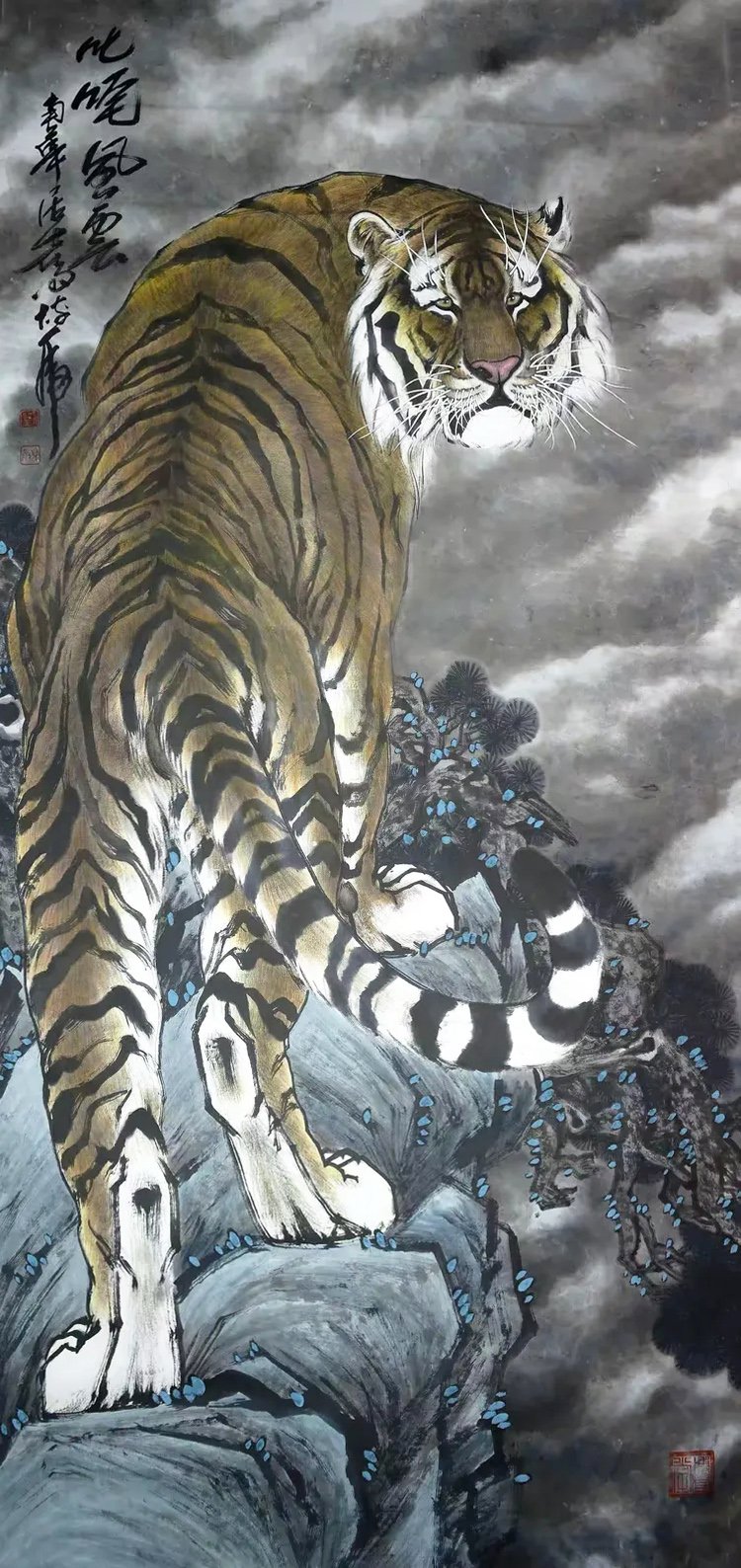 在中国书画艺术的长河中,以虎为题材的创作历来是艺术家们彰显笔墨功力与精神追求的重要载体。虎,作为兼具自然灵性与文化象征的百兽之王,既承载着中华民族对自然与生灵的敬畏、对力量与勇气的崇尚,更凝结着东方美学“以形写神、以艺载道”的深层追求。从五代石恪的《二祖调心图》到近现代张善孖的《百虎图》,虎画艺术始终在传承中不断革新。而被誉为“神州虎王”的当代艺术家刘化雨,以数十年匠心深耕虎画领域,打破了传统虎画的题材边界与技法局限,将水墨韵律与时代精神熔铸于笔端,用笔墨为虎注入灵魂。其笔下的虎不仅兼具传统水墨的气韵与现代审美的张力,更以“百兽之王”的威猛气魄、“百虎呈祥”的创作格局,为当代书画如何“守正创新”提供了极具价值的范本,其艺术实践也为当代书画如何传承文脉、回应时代提供了生动注解,成为弘扬中华优秀传统文化、传递人与自然和谐理念的艺术典范。
