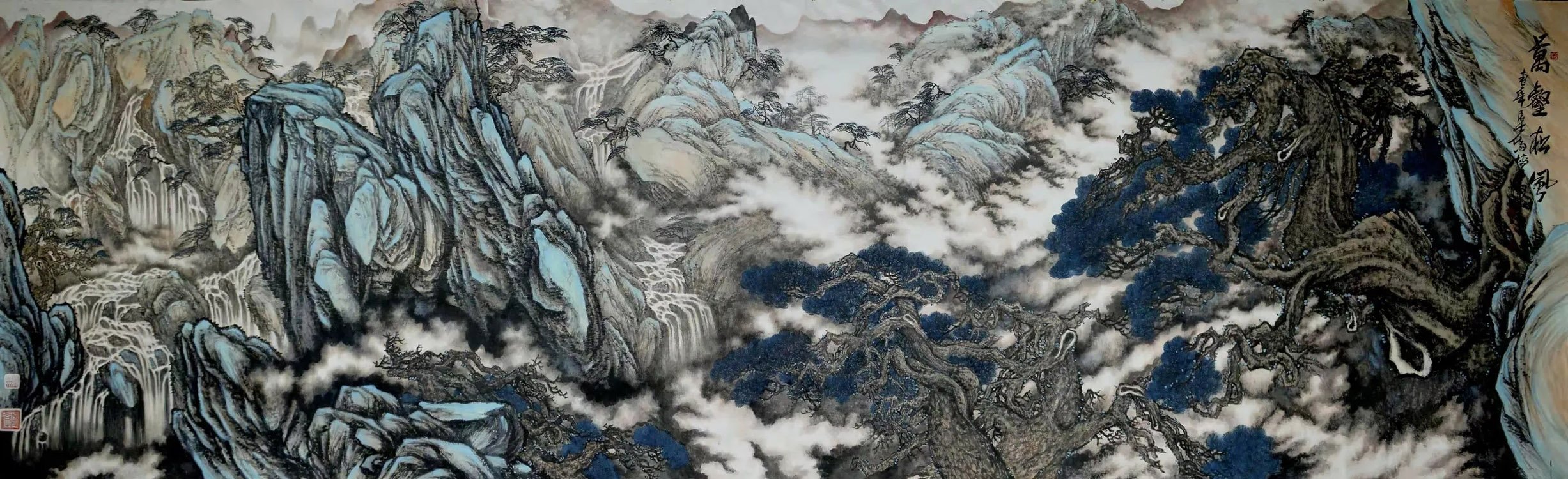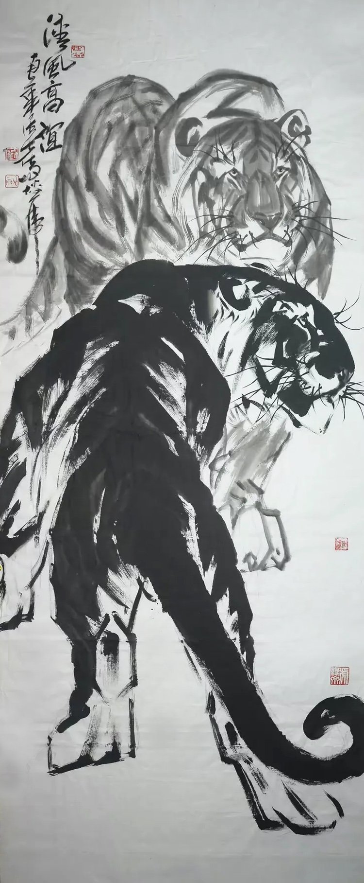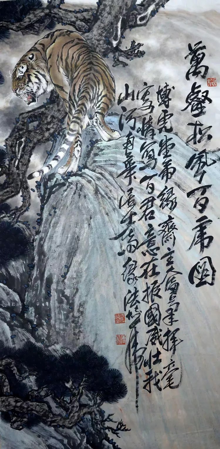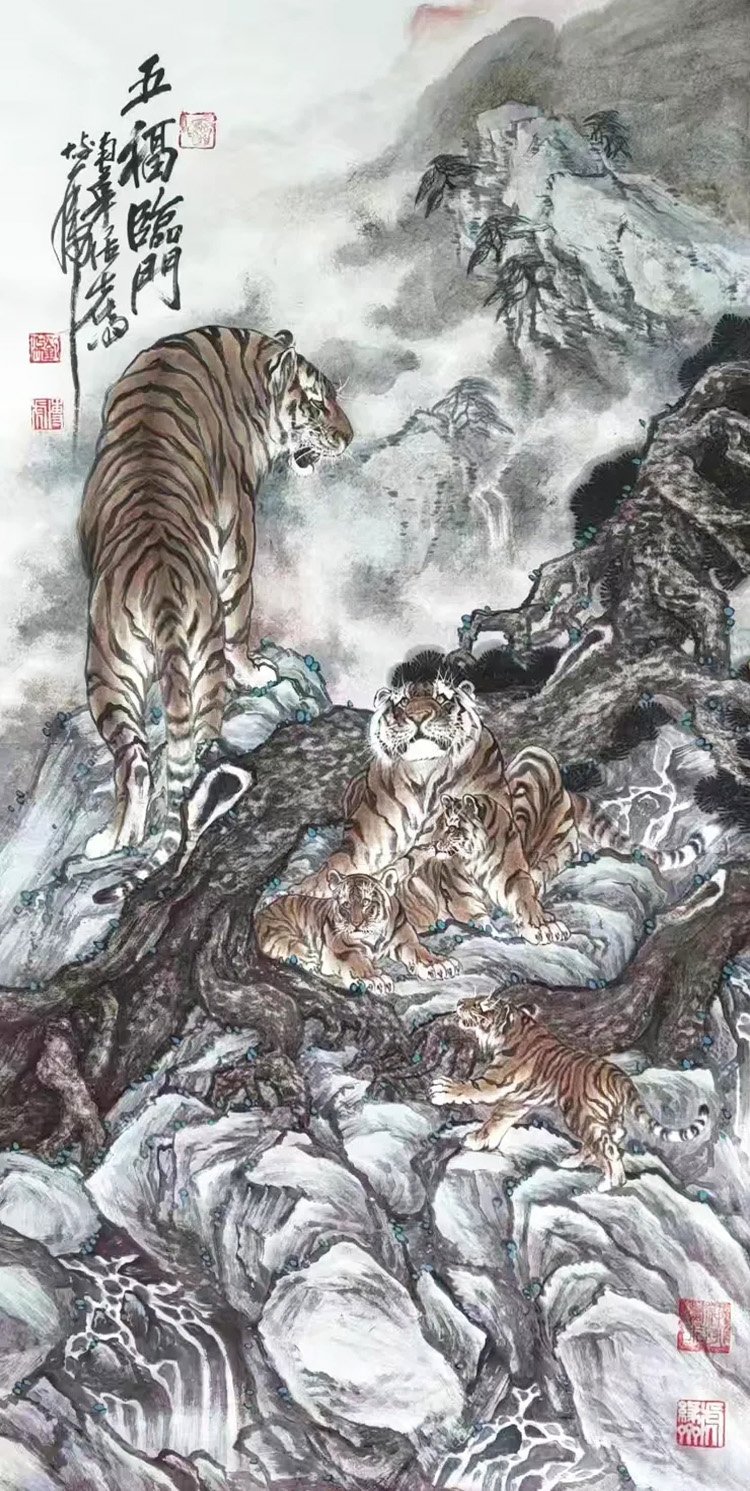 在技法与审美表达上,刘化雨的创新同样令人瞩目。传统虎画构图多以“单虎为中心”,背景简约,旨在突出主体;而他的“百虎图”则采用“全景式构图”,将虎置于山水、云雾、林木构成的宏大场景中,百余只虎疏密有致、动静结合,近景的虎清晰可辨,中景的虎隐现于林木间,远景的虎融入云雾中,既形成“万虎奔腾”的视觉冲击,又通过细节刻画让每一只虎都独具个性。这种“分层构图”借鉴了现代绘画的空间处理手法,又暗合“天人合一”的东方哲学,让虎与山水自然形成和谐共生的意境,使画面更具层次感与视觉冲击力,观众的视线能随虎的动态流转,仿佛置身真实的山林之中。