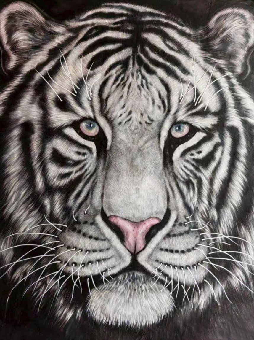 在笔墨与设色的创新上,刘化雨的探索更显独到。传统水墨虎画多以黑白为主色调,而他则在“墨为主”的基础上,巧妙融入浅绛、青绿等色彩:虎的眼周用淡赭石晕染,既凸显眼神的灵动,又增添一丝温情;背景的松树用花青淡染,与虎的墨色形成冷暖对比,让画面更显清新雅致。这种“色不压墨”的设色理念,既保留了水墨“墨分五色”的韵味,又满足了当代观众的审美需求。更难得的是,他将“书画同源”的理念贯穿创作始终——其笔下虎的线条,不仅有绘画的造型功能,更有书法的笔墨韵味:勾勒虎爪时,线条如“撇捺”般遒劲有力;描绘虎尾时,线条如“竖弯钩”般灵动飘逸。这种“以书入画”的技法,让虎画更具笔墨张力,也让东方书画的文化内涵在作品中得以彰显,实现了传统水墨与现代审美的完美平衡。