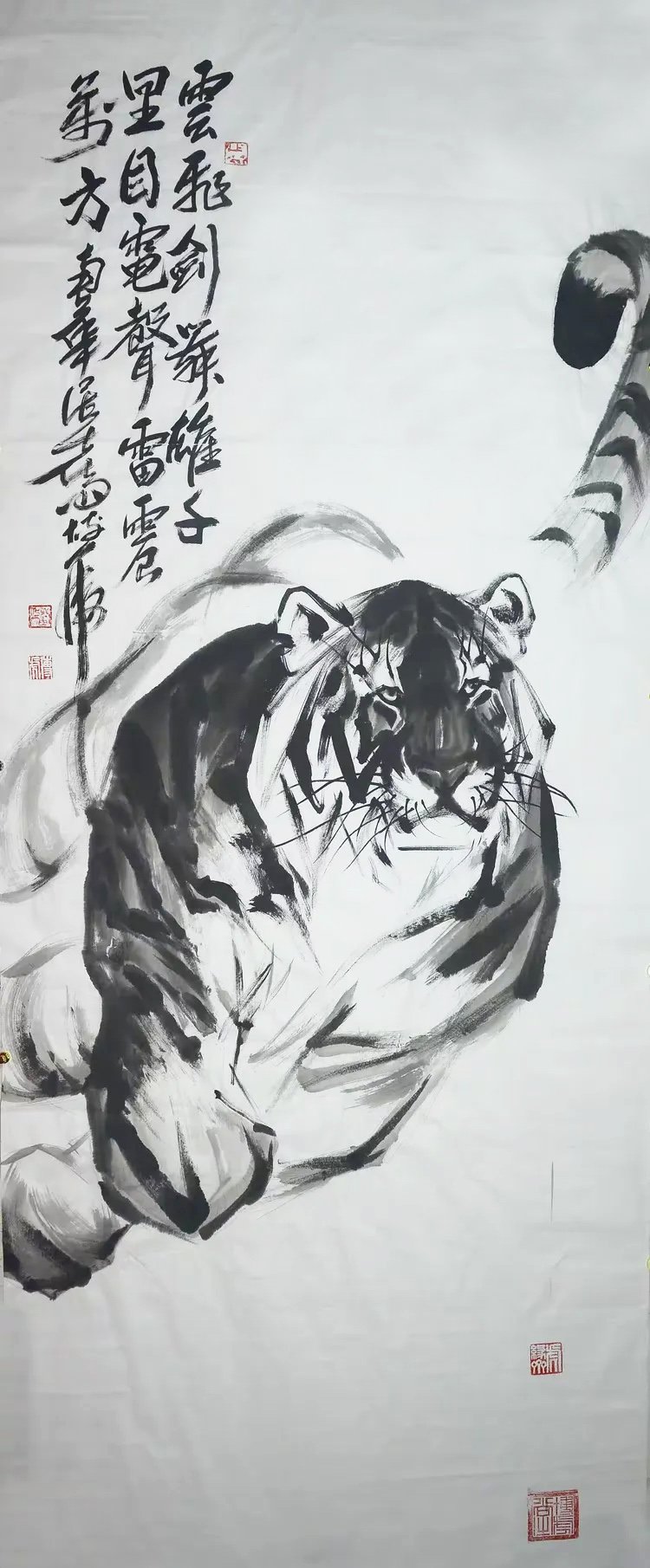 从传统文化传承来看,他深度挖掘虎文化的民族基因,将数千年的虎图腾、民间虎信仰与当代精神相融合。在《虎图腾》系列作品中,他借鉴商周青铜器上的虎纹元素,以厚重的墨色勾勒虎头轮廓,眼神锐利如青铜纹饰,既保留传统图腾的威严,又赋予其“民族气魄”的当代解读;在《镇宅神虎图》中,他吸收民间年画中虎的“吉祥寓意”,以朱砂点染虎目,搭配牡丹、祥云等元素,既符合大众对“辟邪纳福”的文化期待,又通过笔墨的精致化处理,提升了作品的艺术格调。这种“取传统之魂,赋当代之形”的创作,让千年虎文化在笔墨中获得鲜活生命力,助力传统文化的“创造性转化、创新性发展”。