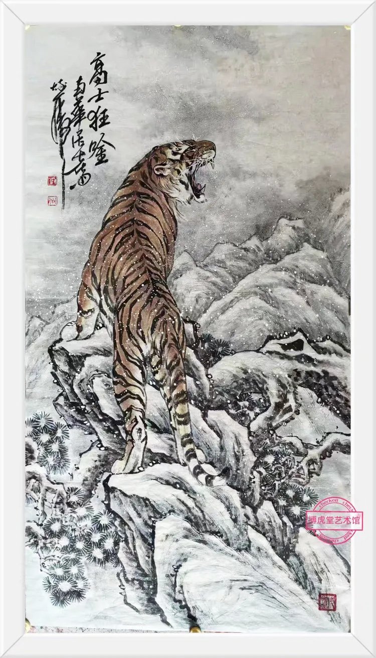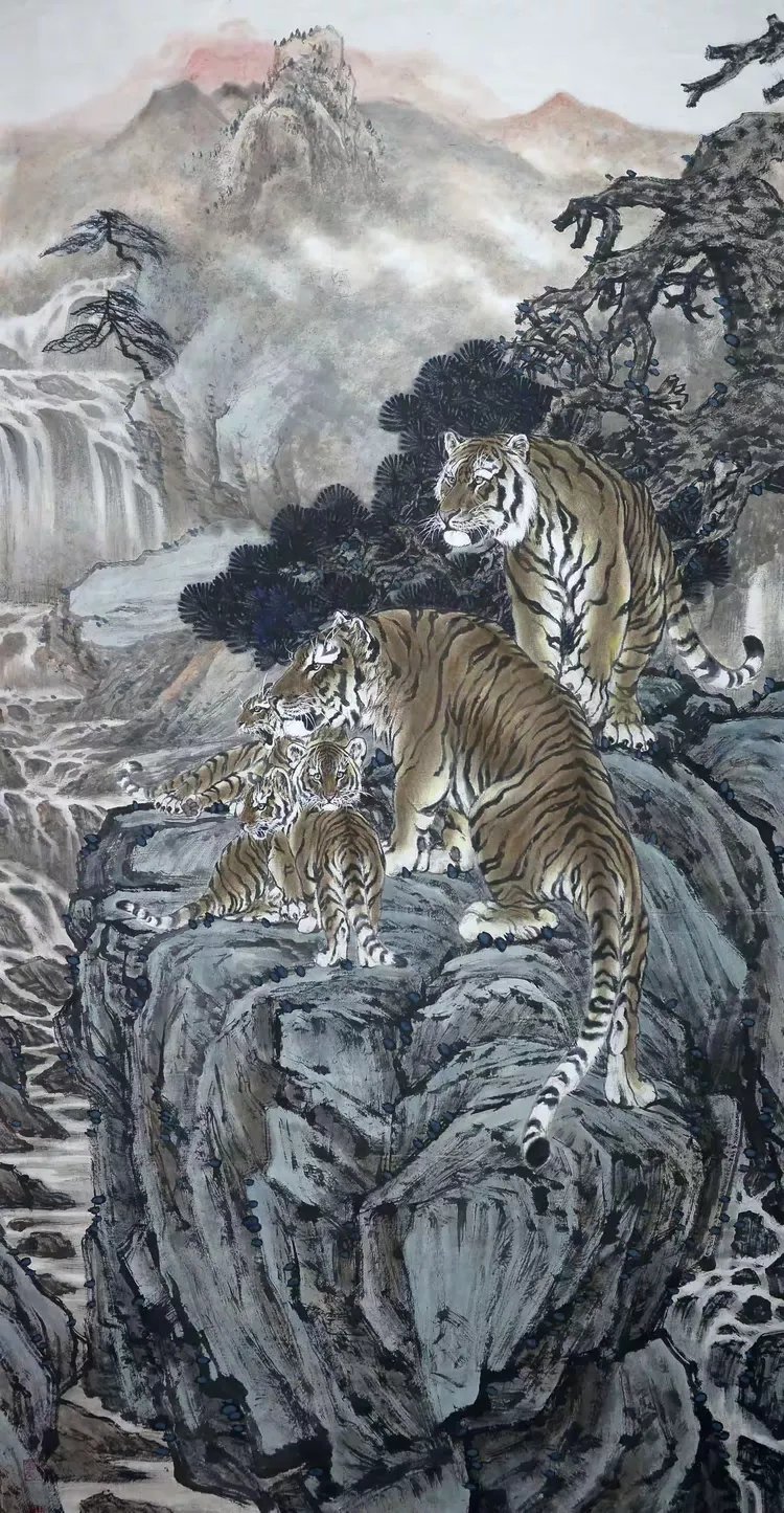 刘化雨的虎画能在当代画坛脱颖而出,核心在于其“守传统之魂,创时代之新”的艺术理念。传统虎画多注重“形似”与“威态”,技法上常以工笔重彩勾勒虎的皮毛纹理,或以大写意泼墨表现虎的气势,但刘化雨在继承这些传统技法的基础上,融入了现代文艺思想,使作品在题材、构成、设色、风格理念上实现了全面拓展。在题材上,他打破了“虎必威猛”的固有认知,将虎置于更丰富的自然场景中——既有“虎啸山林”的壮阔,也有“虎戏幼崽”的温情,还有“虎卧雪地”的静谧,这种题材的拓展,让虎画从“神兽崇拜”走向“生命关怀”,更贴近当代人对“生命平等”“自然和谐”的思考。