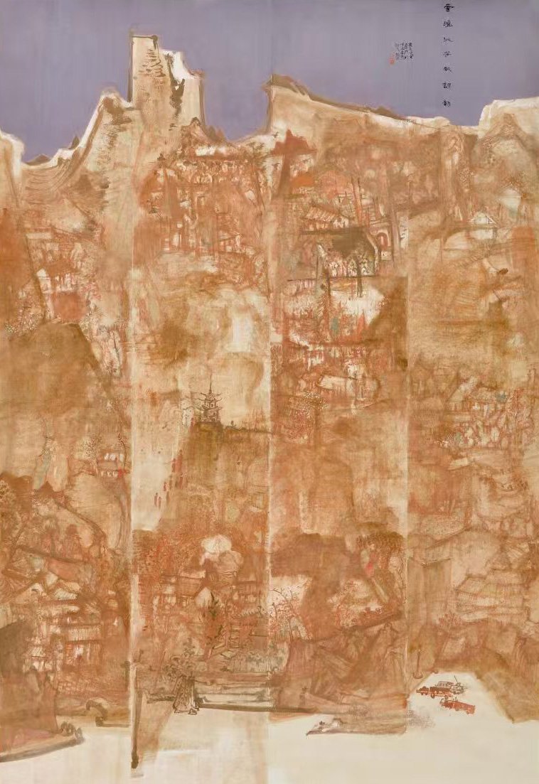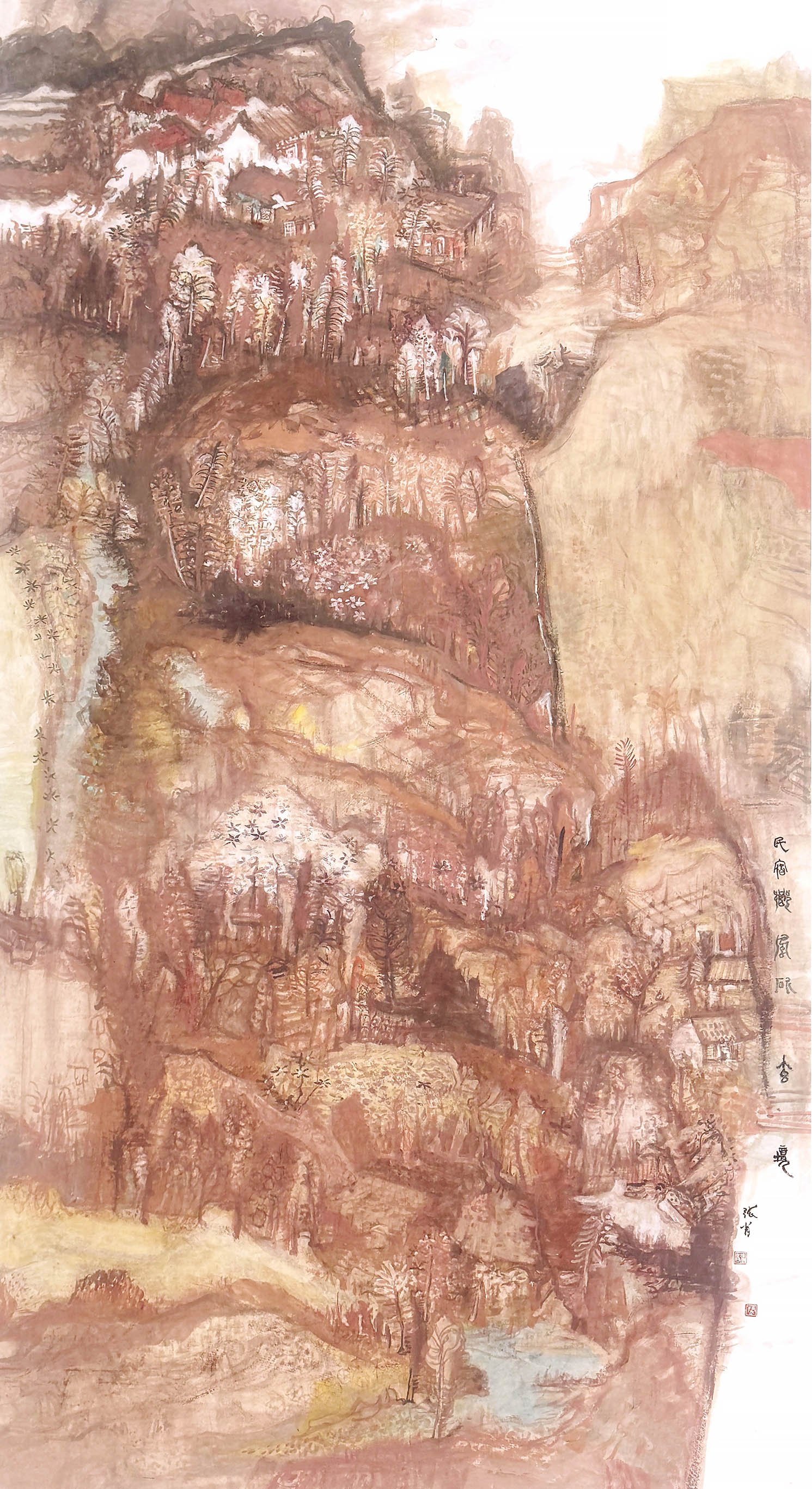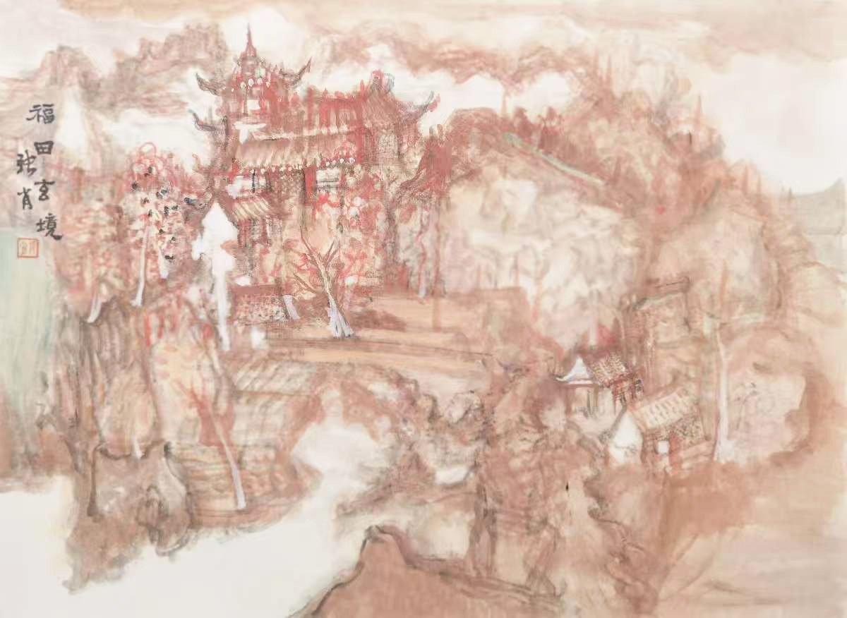 在画面色彩上,张肖学习借鉴青绿山水、浅绛山水以及西画色彩规律,丰富作品整体的色彩表现力,营造符合主题的意境与氛围。传统山水以“水墨焦浓重淡清”为基调,张肖则用主观化的色彩系统重构山水的情绪质感:如《福田玄境》系列作品中,她以赭石、花青等色彩破墨,让水墨的“淡远”与色彩的“温润”相融。那些晕染开的赭色,不是对自然的写实描摹,而是对山水精神的“写意化着色”,既保留了文人画的雅致,又跳出了“水墨为上”的窠臼,让画面有了更丰富的情绪层次。她的“古意”,是“活的传统”:不复制古人的笔法,而承接古人的“心境”——以墨色的浓淡写山水的呼吸,以线条的疏密藏诗意的留白,让文人画的雅致,成了画面的“底色”而非“标签”。