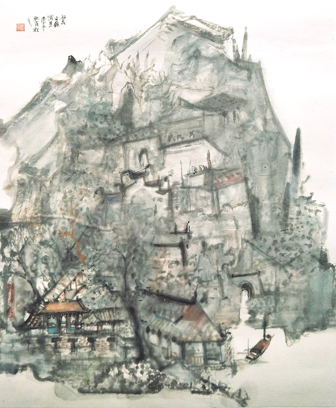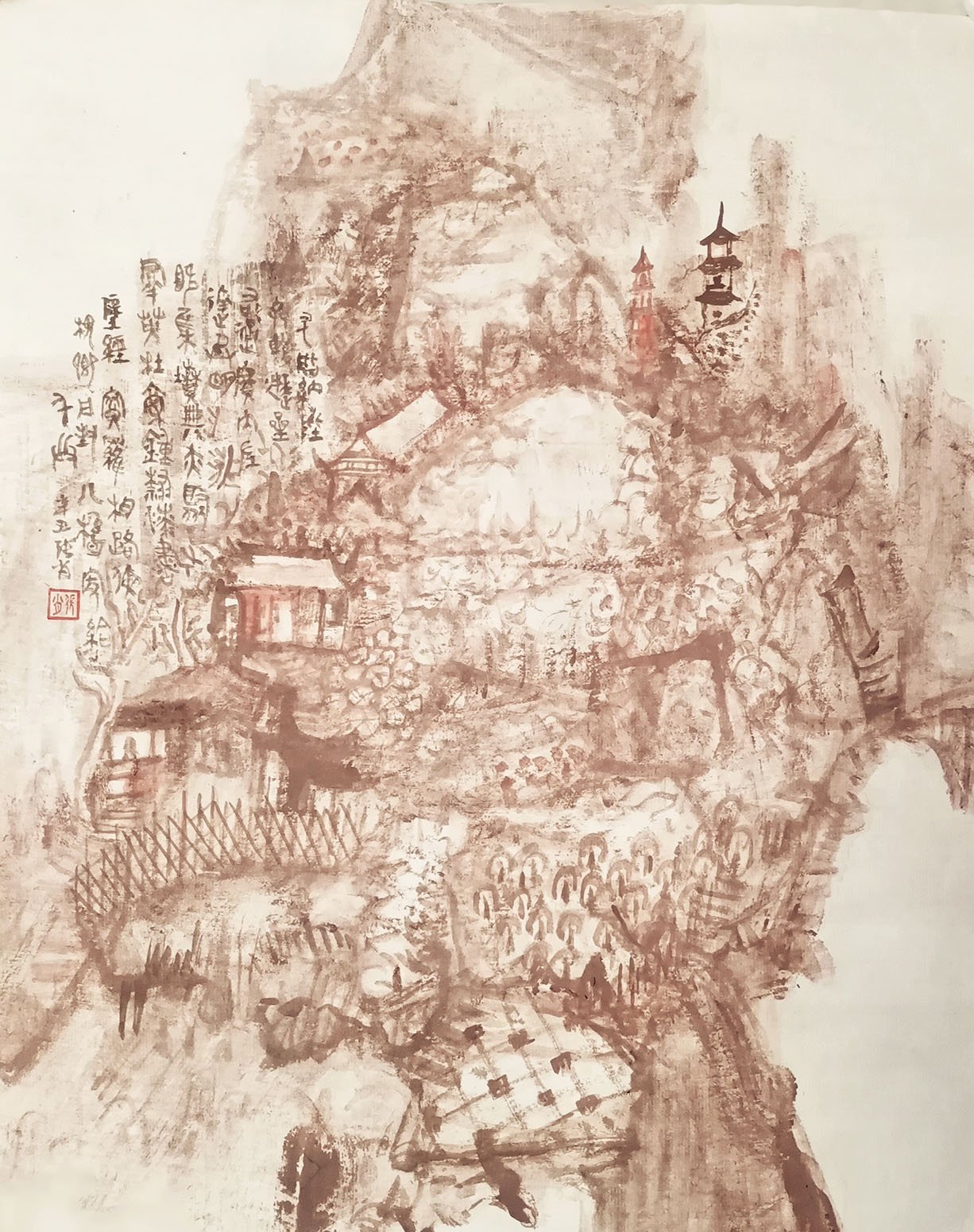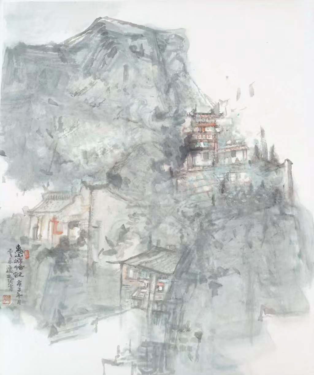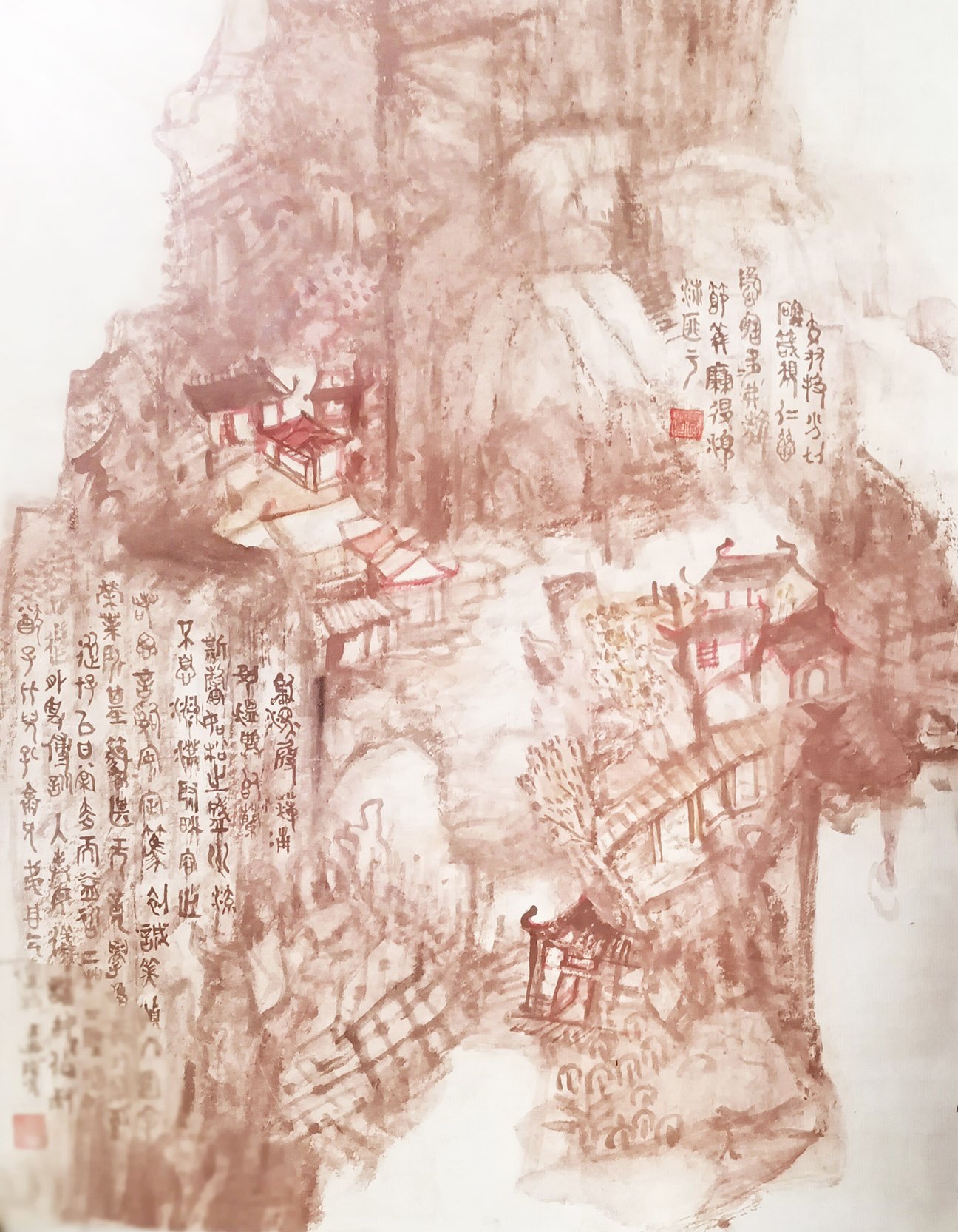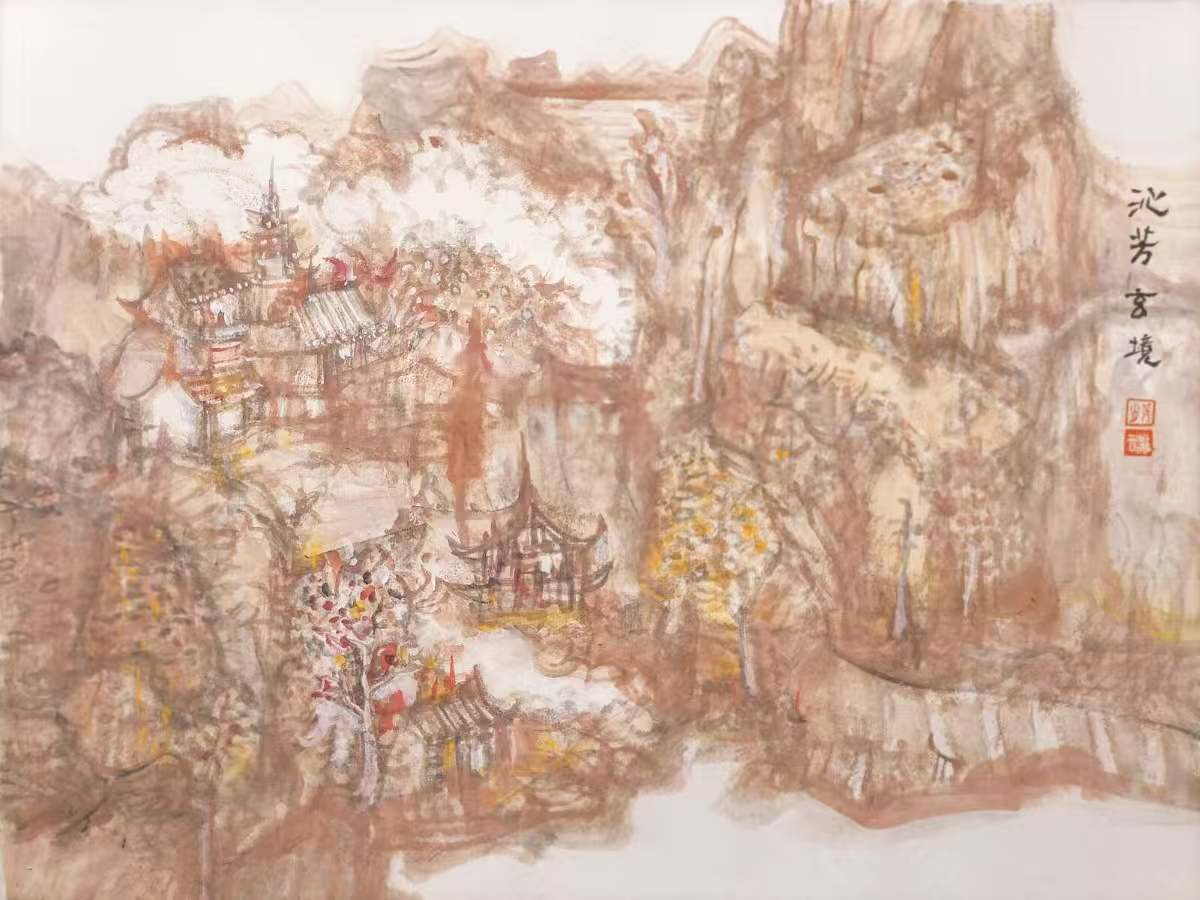 在张肖的笔墨世界里,“画”从来不是单一的视觉艺术——它是架上文字生长出的意境,是常盈耳畔的音符晕染成的墨色,是文、乐、画交织的“通感场域”,是玄境里的诗意栖居。张肖的作品,始终带着“文学性”的底色。她以古籍诗思为精神养分,让画面跳脱出写实的桎梏,生长出“玄境”的朦胧与深邃:《沁芳玄境》里的楼阁隐于烟霞,似是《桃花源记》中“屋舍俨然”的异世;《南太行茶马古道游悟记》的山石间留白如诗,笔墨未及处尽是“只在此山中,云深不知处”的余韵。
