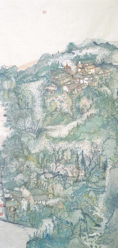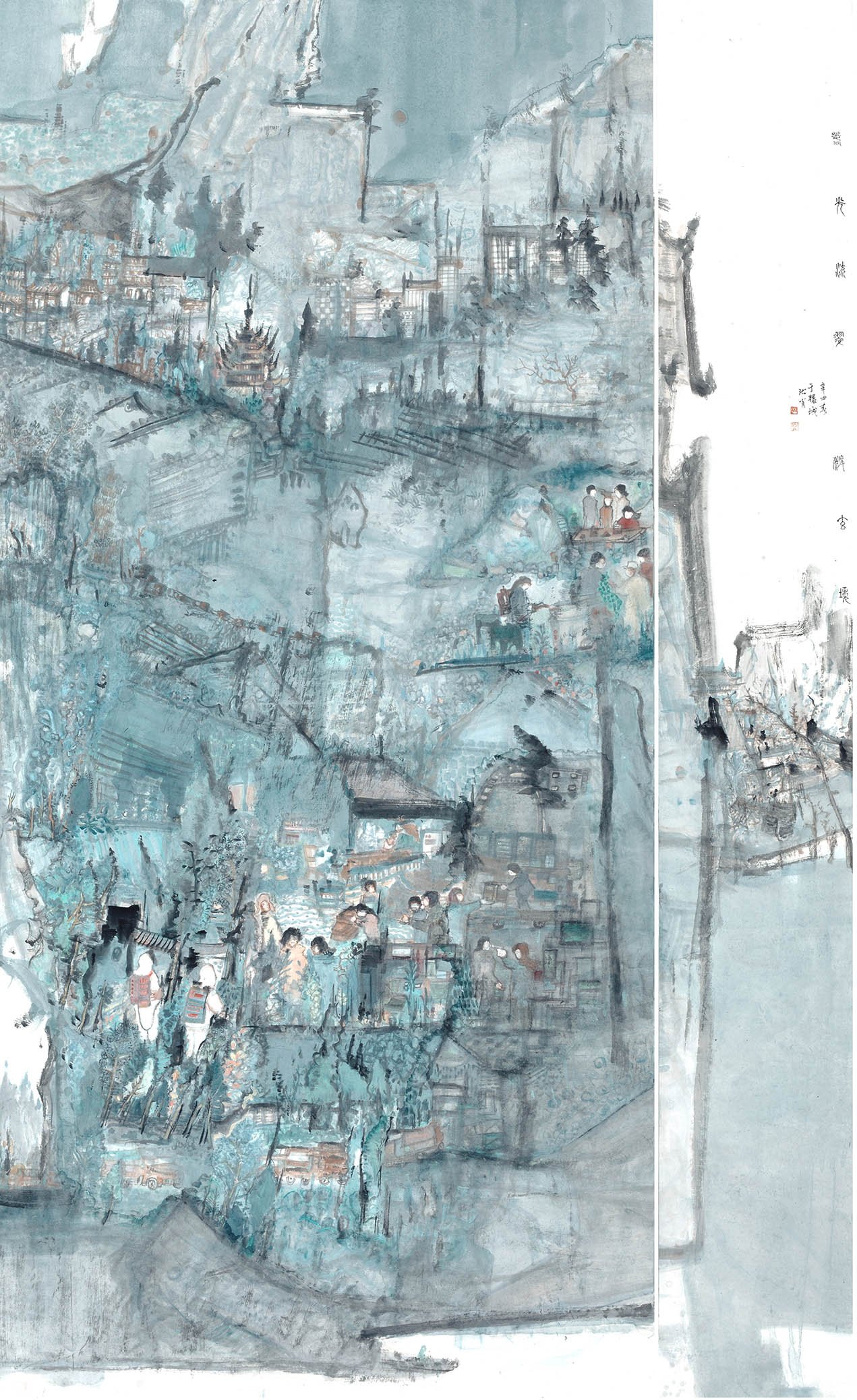 传统山水多以“三远法”构建“可望可游不可居”的宏大远境,而张肖的作品重构了山水的空间逻辑:她以层叠嵌套的“微缩聚落”图式,把山水与人文场景压缩在同一视觉平面里。比如《春光流翠渡玄境》,画面没有传统山水的“留白透气”,而是让吊脚楼、石阶、市集从山体褶皱里生长出来,屋舍与草木、行人与崖壁相互咬合,既保留了山水的壮阔肌理,又让生活场景成为山水的“有机部分”;《玄境沁芳斫诗韵》则以“折叠式构图”,让村落、亭台、巷道在山体间交错排布,打破了“近景-中景-远景”的层级界限,使“林泉”不再是远观的风景,而是可穿行、可停留的生活场域。