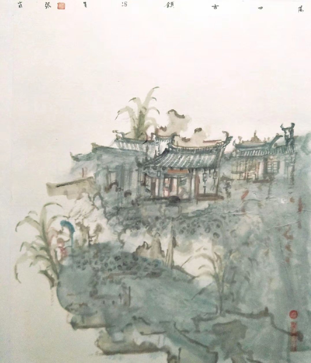 这种“以山水载生活”的境象,暗合了中国山水“天人合一”的内核,亦注入了当代视角,古人的“共生”是逃离世俗,张肖的“共生”是拥抱生活,让山水从“精神的远方”,变成“生活的近处”,完成了传统境象的当代落地。她不写“渔樵隐逸”的古意闲情,而是写“茶烟袅袅、客语悠悠”的今时闲情——那些藏在山岩间的屋舍,是“民宿”,是“乡居”,是现代人对“诗意栖居”的向往。她的山水,是“能住进去的画”,是当代人逃离城市后,心头念着的那方烟火,是可触的“当下生活的镜像”。