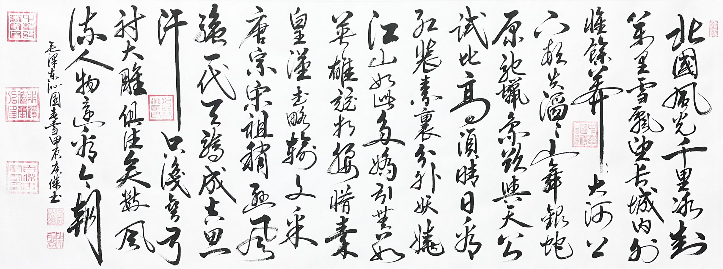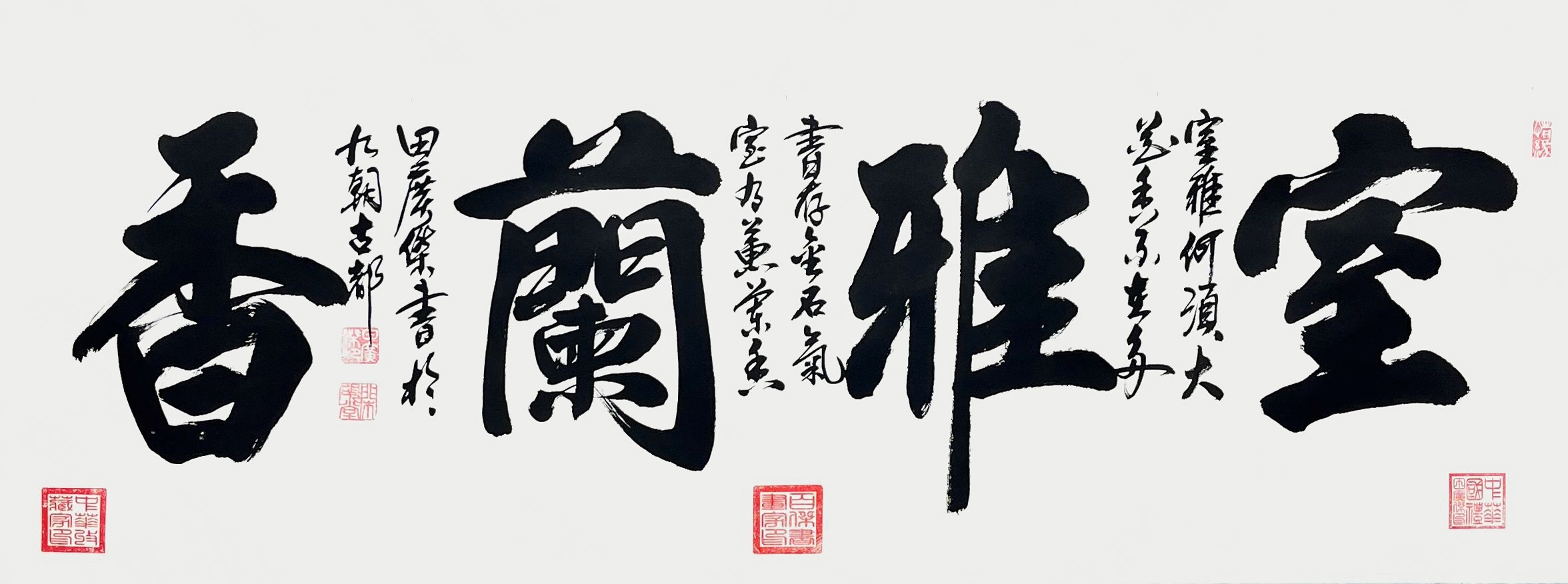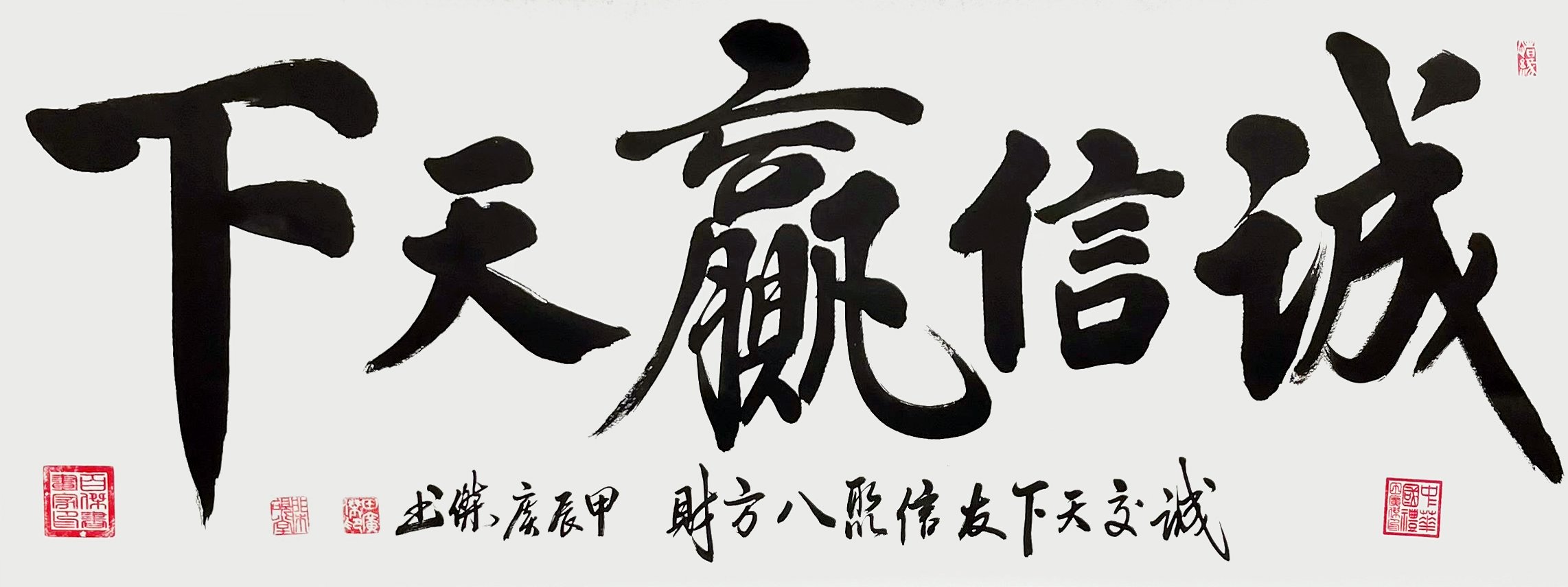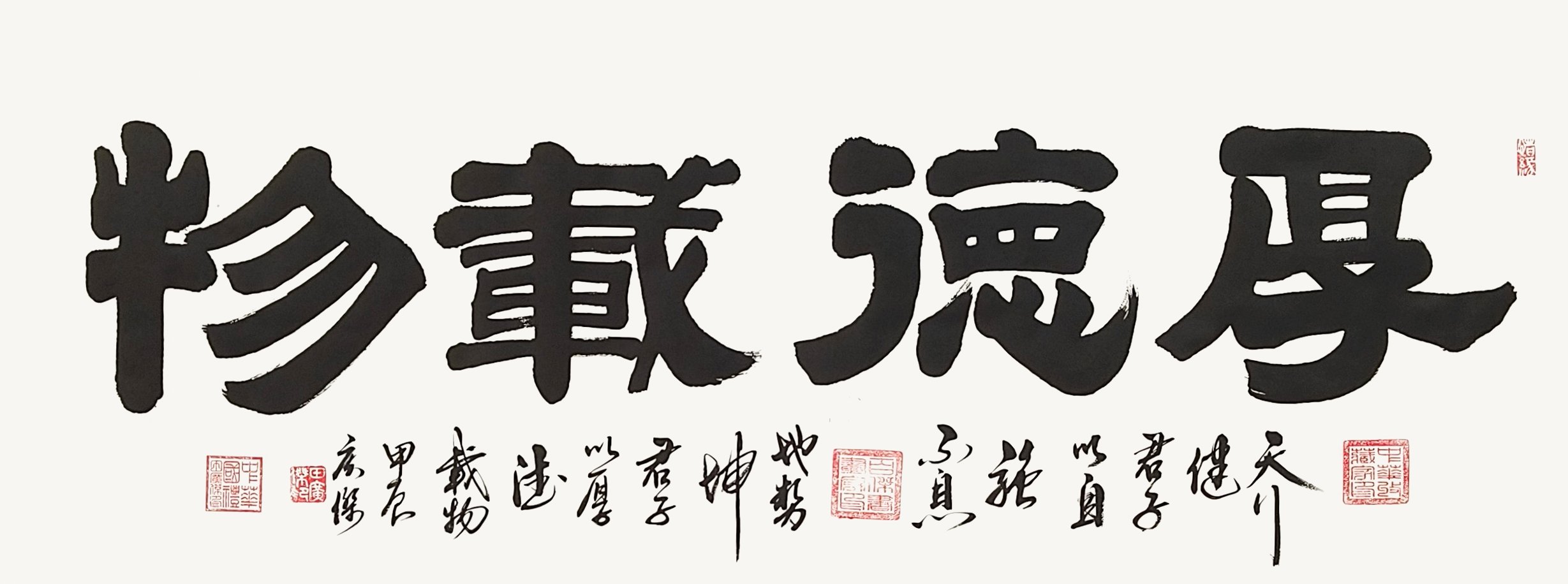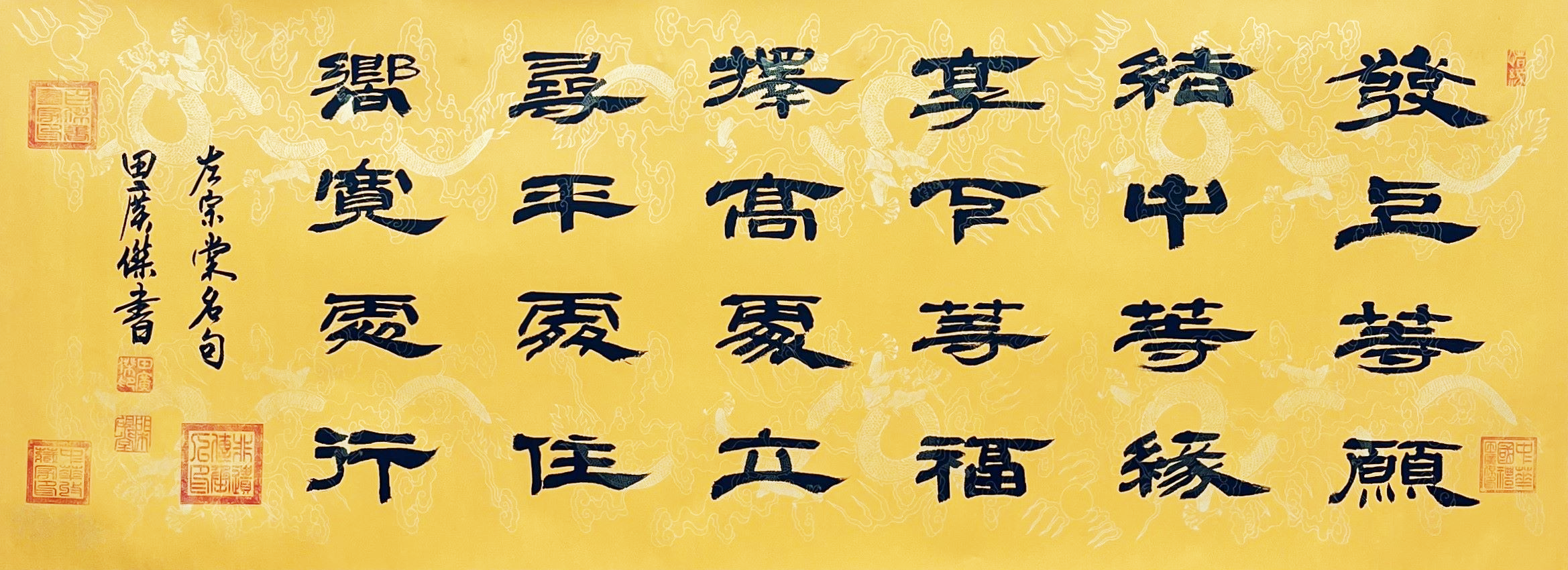 田广杰自幼习书,四体皆能,以隶书、行楷为最著。行书出自“二王”,楷书以《玄秘塔碑》为宗。早年隶作求其精美,取《乙瑛碑》之骨肉匀适,《曹全碑》之端庄秀丽,《礼器碑》之变化如龙,《张迁碑》之方整劲挺。后集百家之长,融古通今,得其形而通其神,精于墨而悟其道。取法经典而不墨守成规,立足传统大胆创新,形成了自己独特的艺术风格。