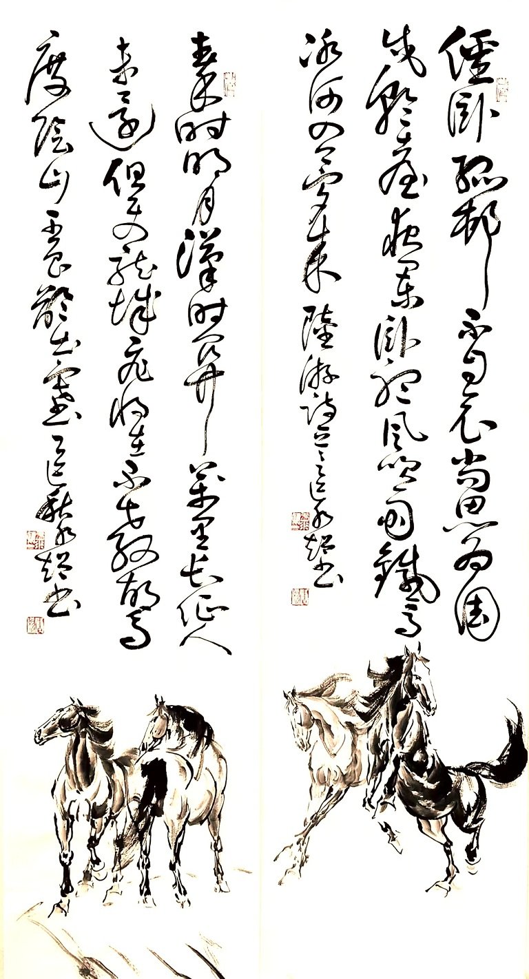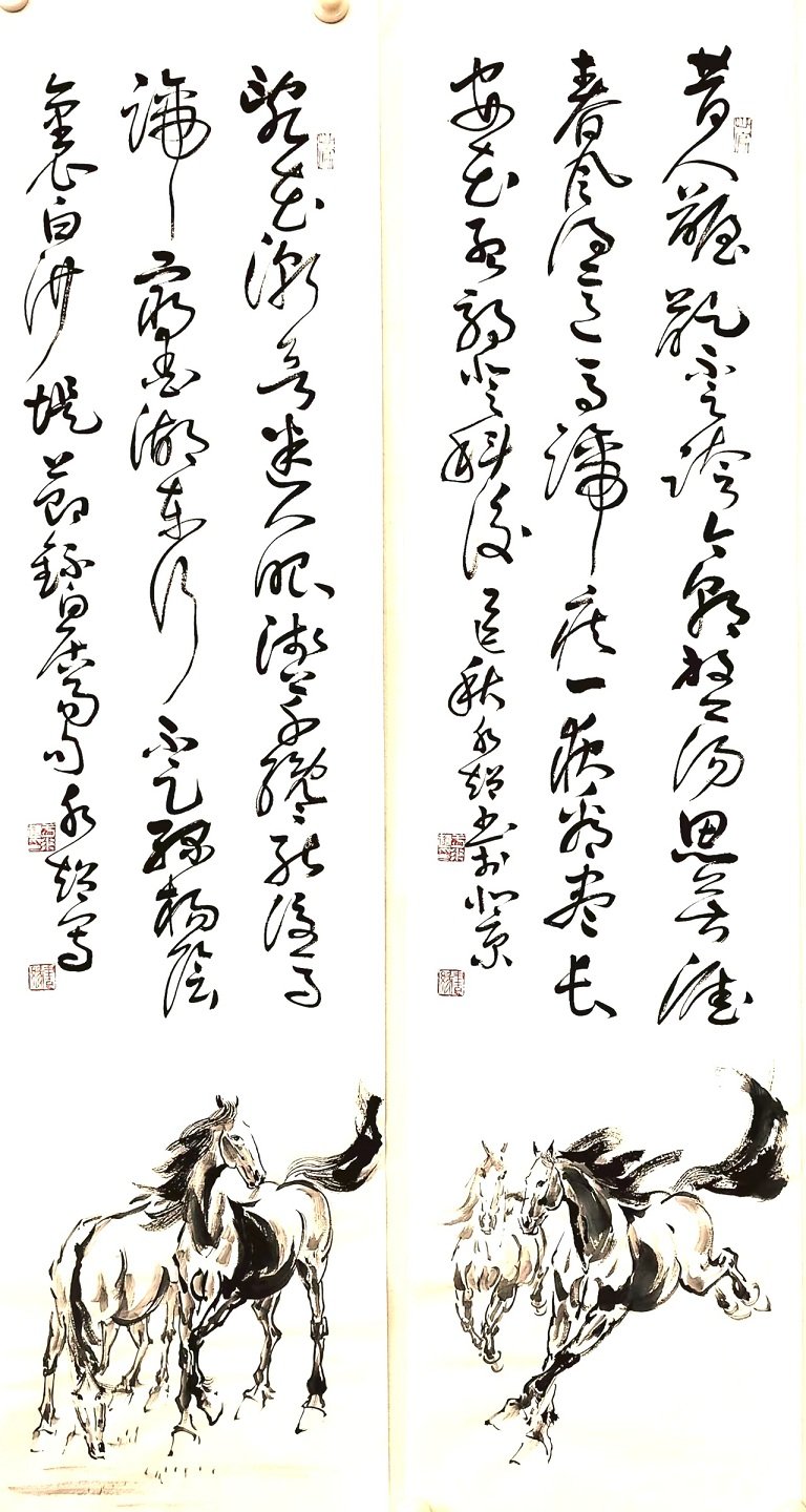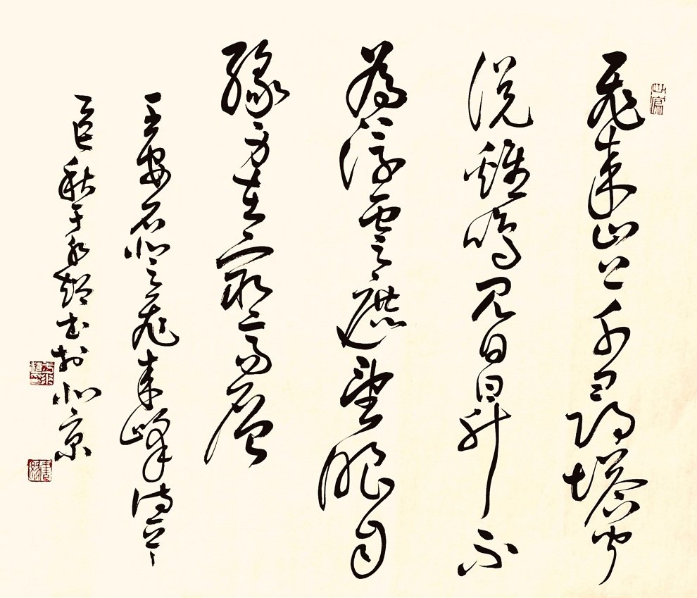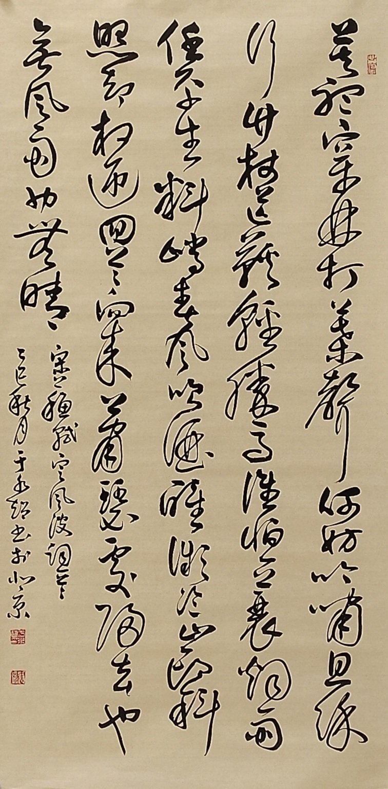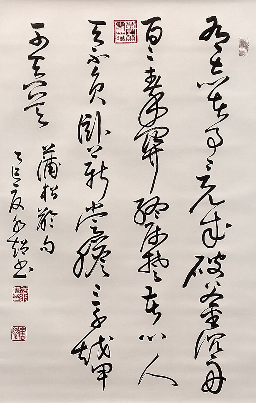 中年拜草书大家李逸野先生为师,日日研习小篆和大草,跨越魏晋直追秦汉,乐此不疲,达到如痴如迷程度,十年磨砺。大草从草圣张芝冠军帖为伴,深研“一笔书”高难度之书法精髓,活用几经失传的“篆籀笔法”入草法,将其发挥到极致,勤学苦练形成肌肉记忆,化古为今,化古归我,逐渐形成了自己的面貌。