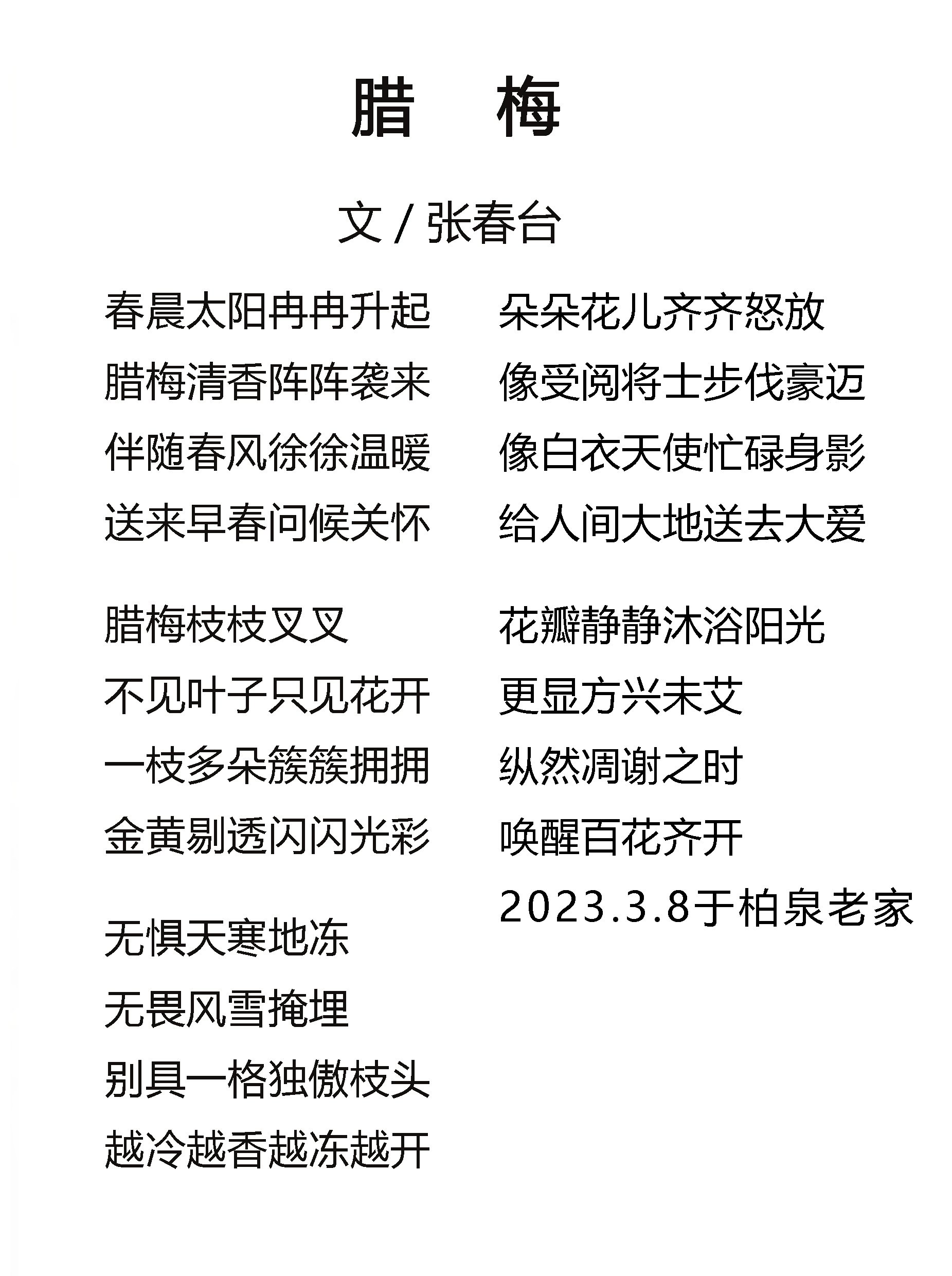 其诗集已由中国书画出版社出版"艺术名家张春台新诗集"。同时获香港银河出版社出版中、英文对照版《张春台短诗选》。另有《七律.国色天香》被选入《苏菲译.世界诗歌年鉴2023卷》并在16个国家出版发行。获"CCTV今日视界"授予"重点推荐艺术家"荣誉证书。