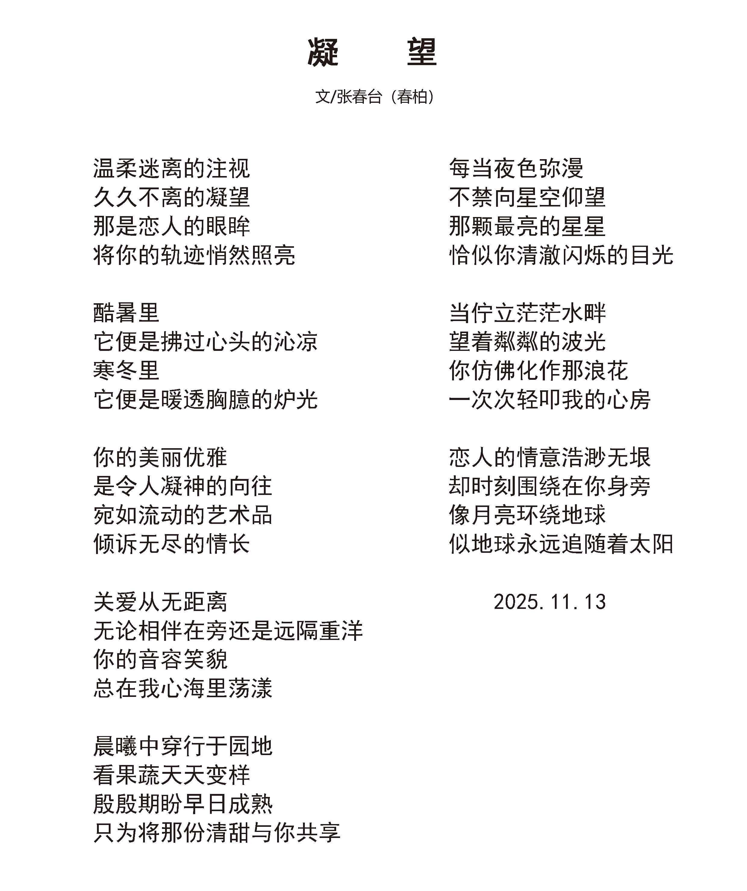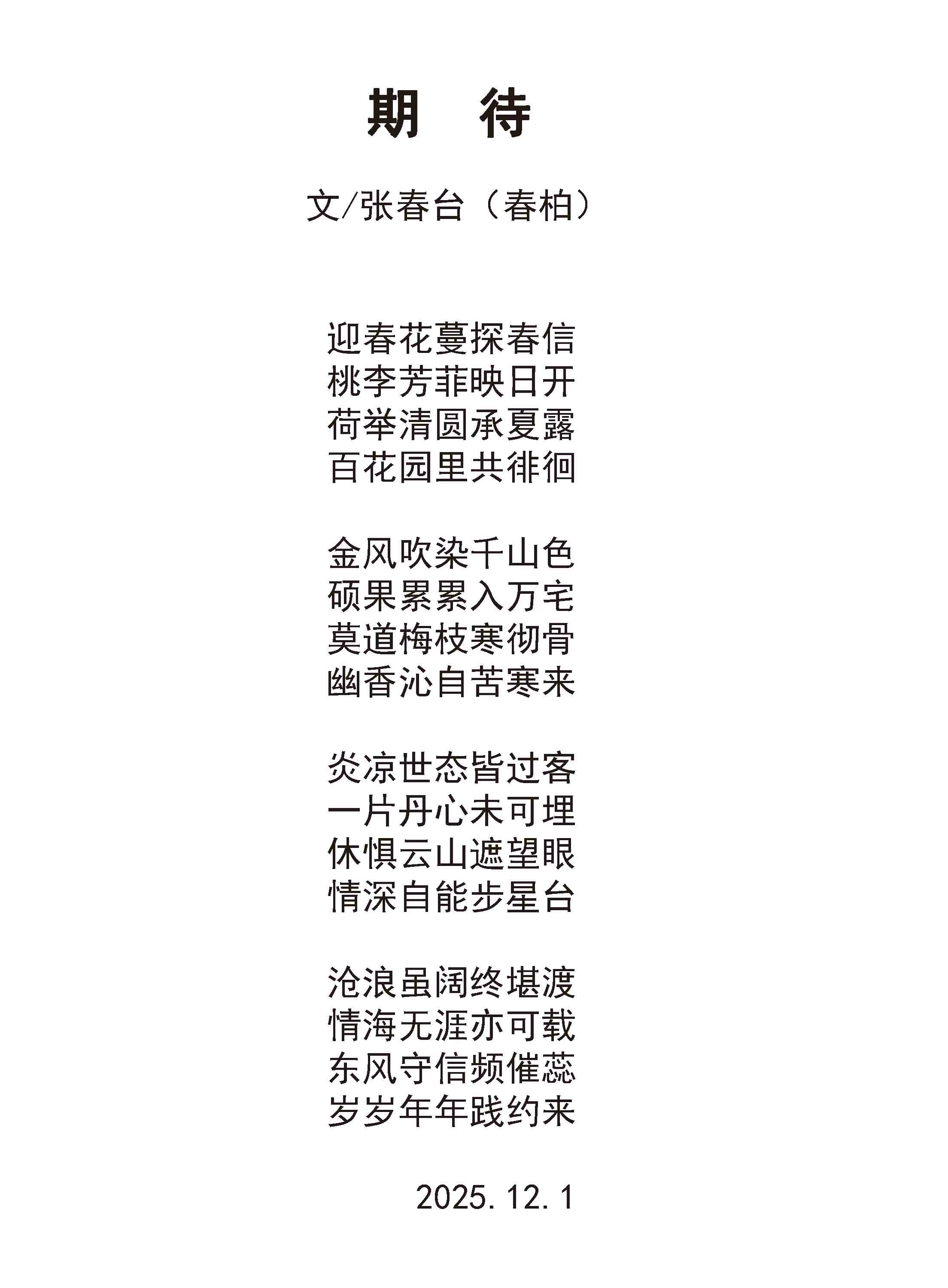 张春台(春柏),诗人,中华诗词学会会员,世界华人音乐家协会会员。NZ国学诗词艺术协会及新西兰文联会员。毕业于湖北大学中文系。获2022年"当代诗人奖"诗词评选大奖特等奖。其代表诗作艺术获2025年网络评选一等奖。