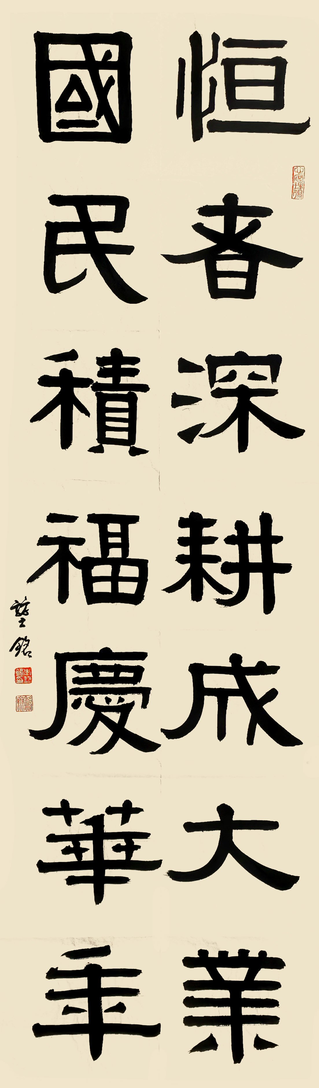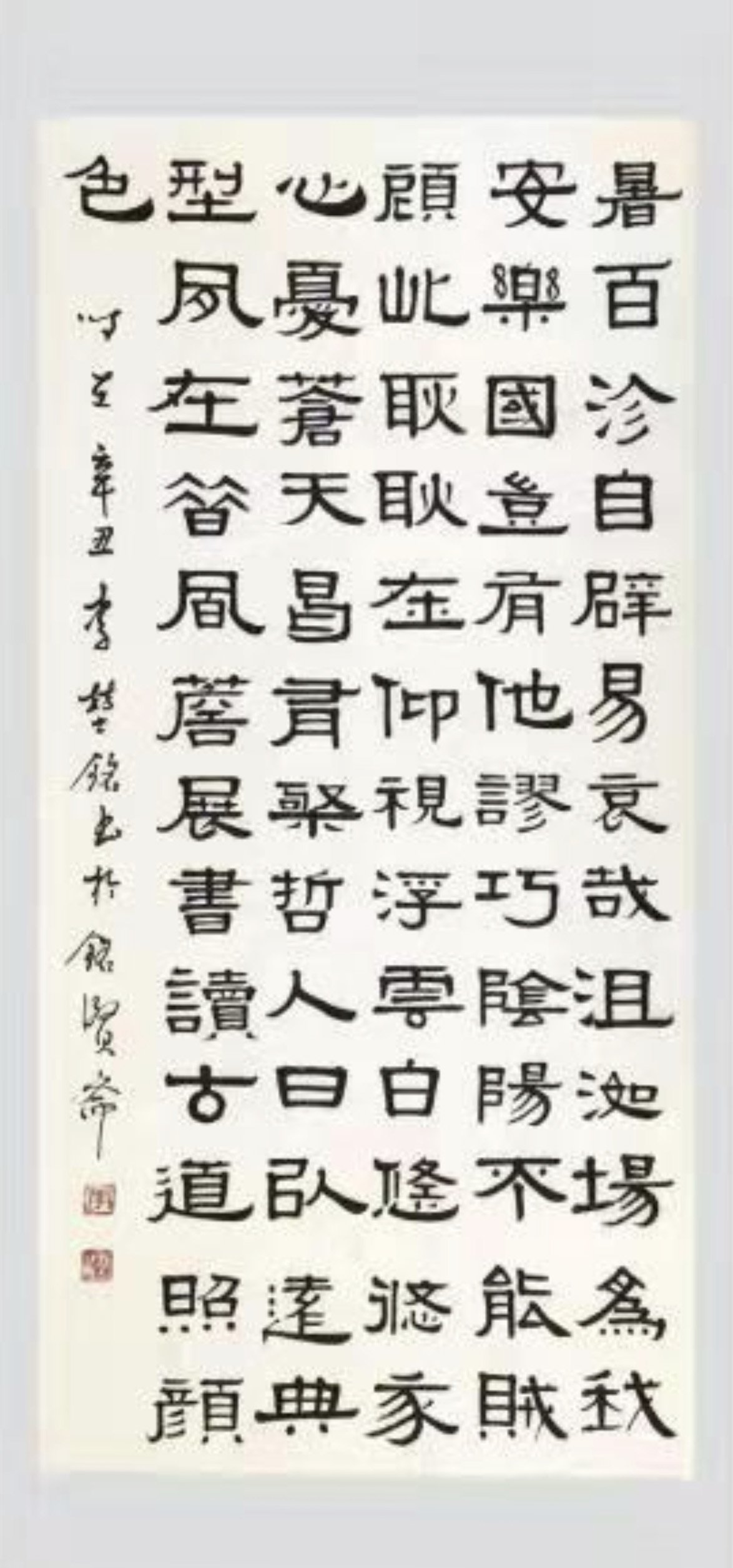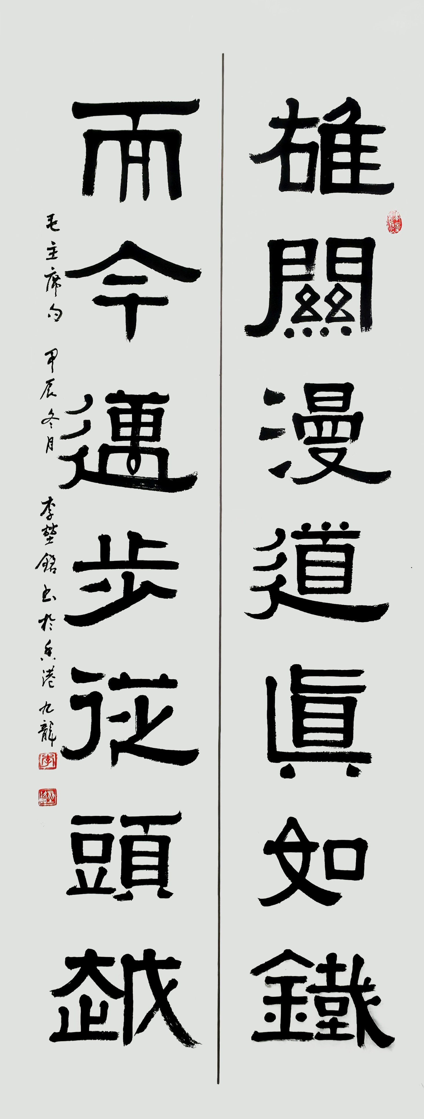 李堃銘的书法根基深植于篆隶。从其作品中可见,他对汉隶的波磔之美、秦篆的圆劲之韵有着深刻的理解与化用。