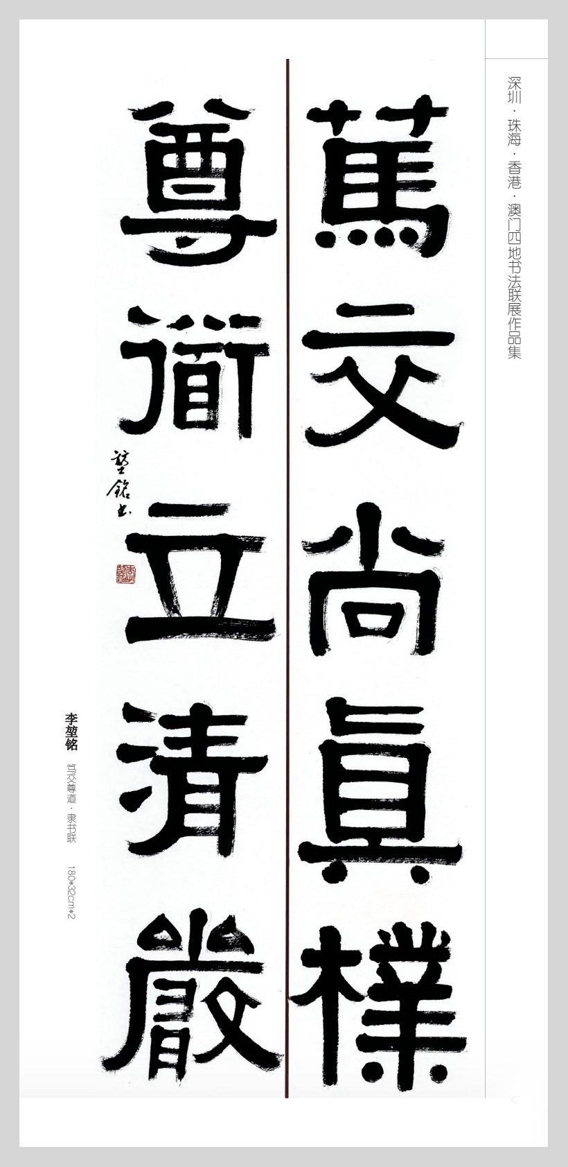 李堃銘先生深耕书坛数十载,是香港书坛兼具深厚功力与人文情怀的代表人物。他的书法,既植根于传统碑帖的法度,又融入了香江地域的人文气息,在篆、隶、草诸体中皆有独到建树,形成了“笔力沉雄、墨韵生动、心手合一”的艺术风貌。