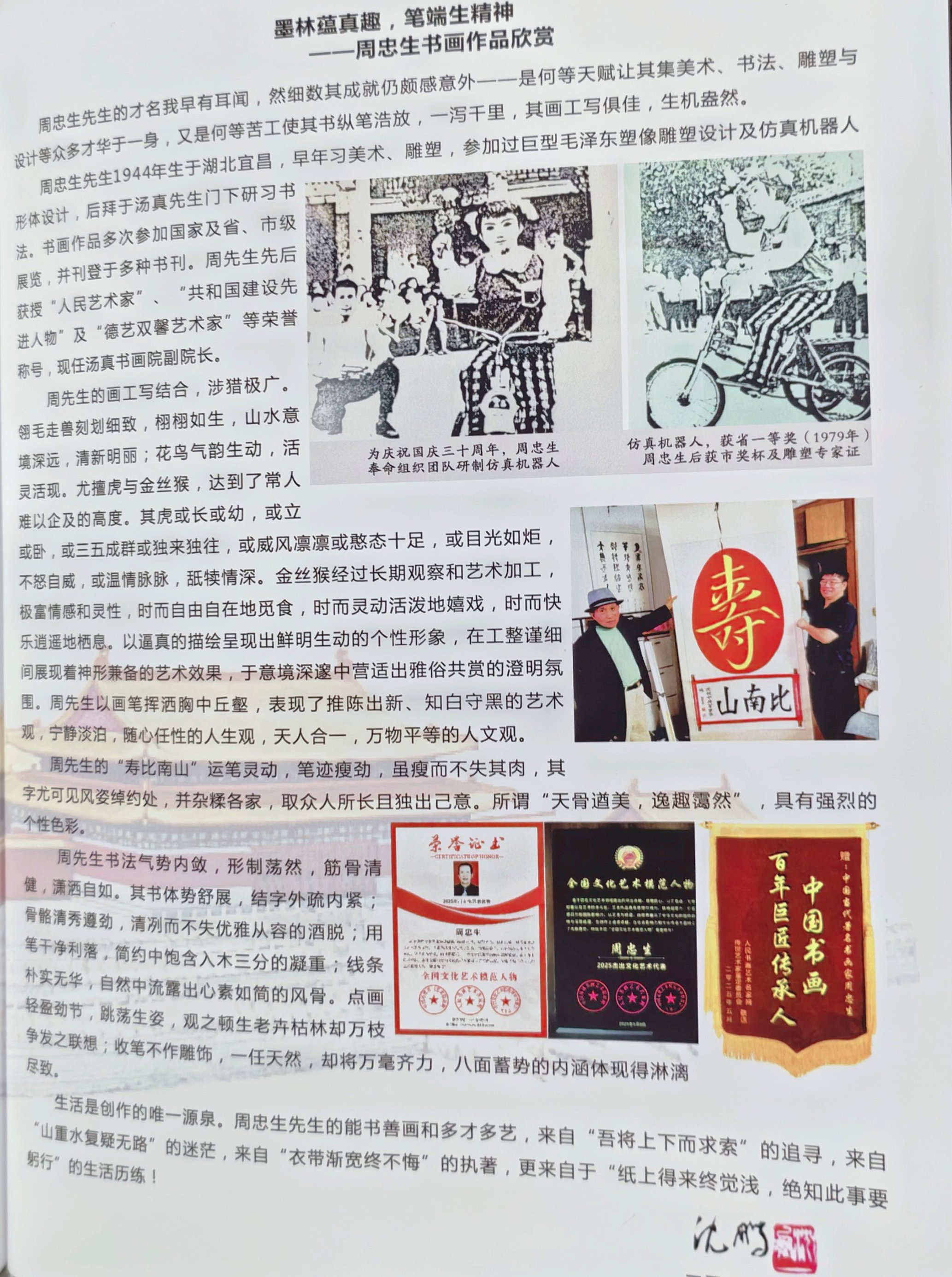 周忠生,中国影响力文化人物,中国功勋艺术家,中国国礼艺术大师,人民艺术家,人民书画家,雕塑家,中央电视台客座教授,中国非物质文化遗产项目传承人,中国国礼艺术家网特聘艺术顾问,汤真书画院副院长,中国传统文化发展委员会副主席。湖北宜昌市人,1944年11月生,受父亲影响从小学美术,书法,雕塑。书画师从汤真大师,任曼逸教授。作品力求气韵生动,古朴清新,创新灵动,创作成果丰硕。