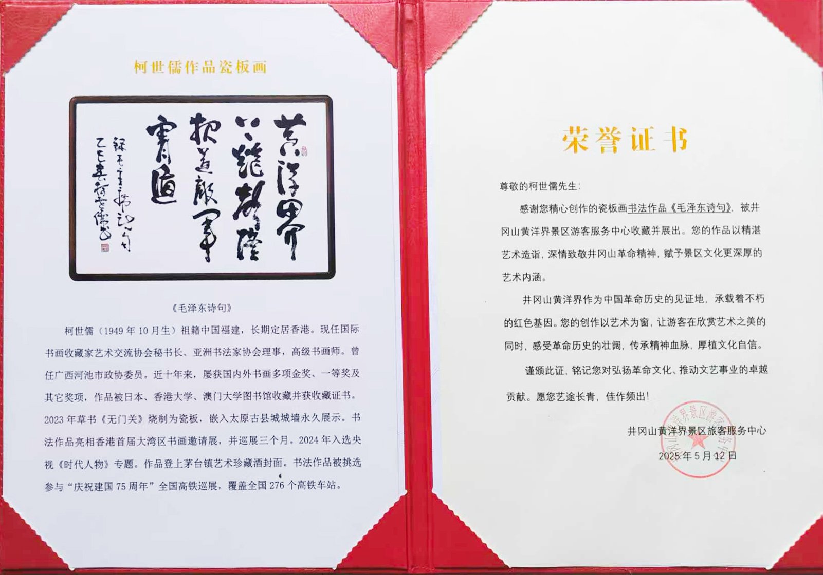 2025年5月,应国家文旅部及中国老革命根据地国家5A级景区,井崗山黄洋界景区服务中心邀请,书法作品《毛泽东诗句》黄洋界上炮声隆,报道敌軍宵遁。被制成大瓷板画镶挂在景区服务中心供遊客长期参阅。作品被有关部门给予很高评价。