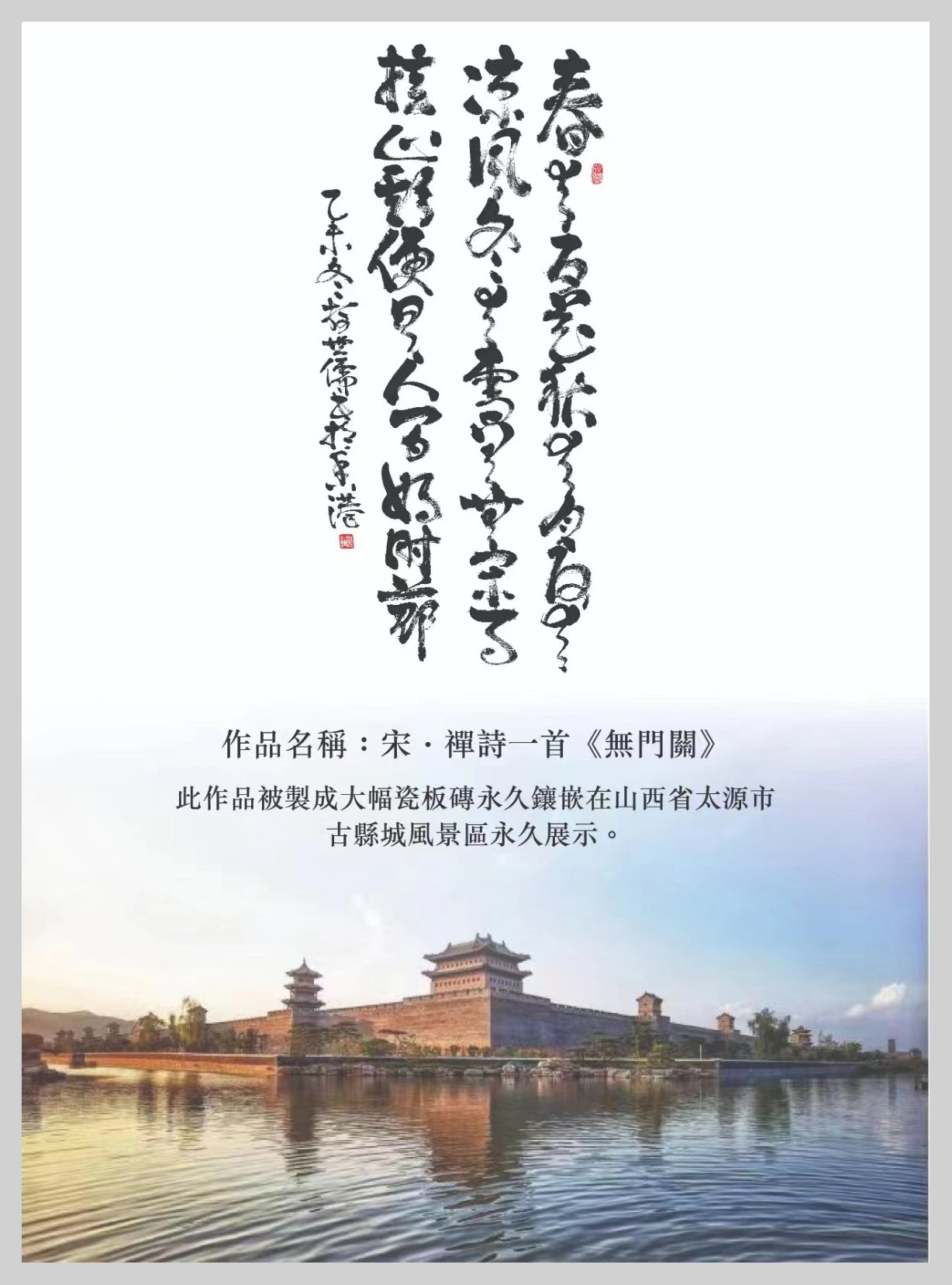 2023年11月,书法作品草书“无门关”,被烧制成瓷板画,嵌入国家名胜古迹中国太原古县城风景区城墙被永久观览,并获发捐赠之证书。