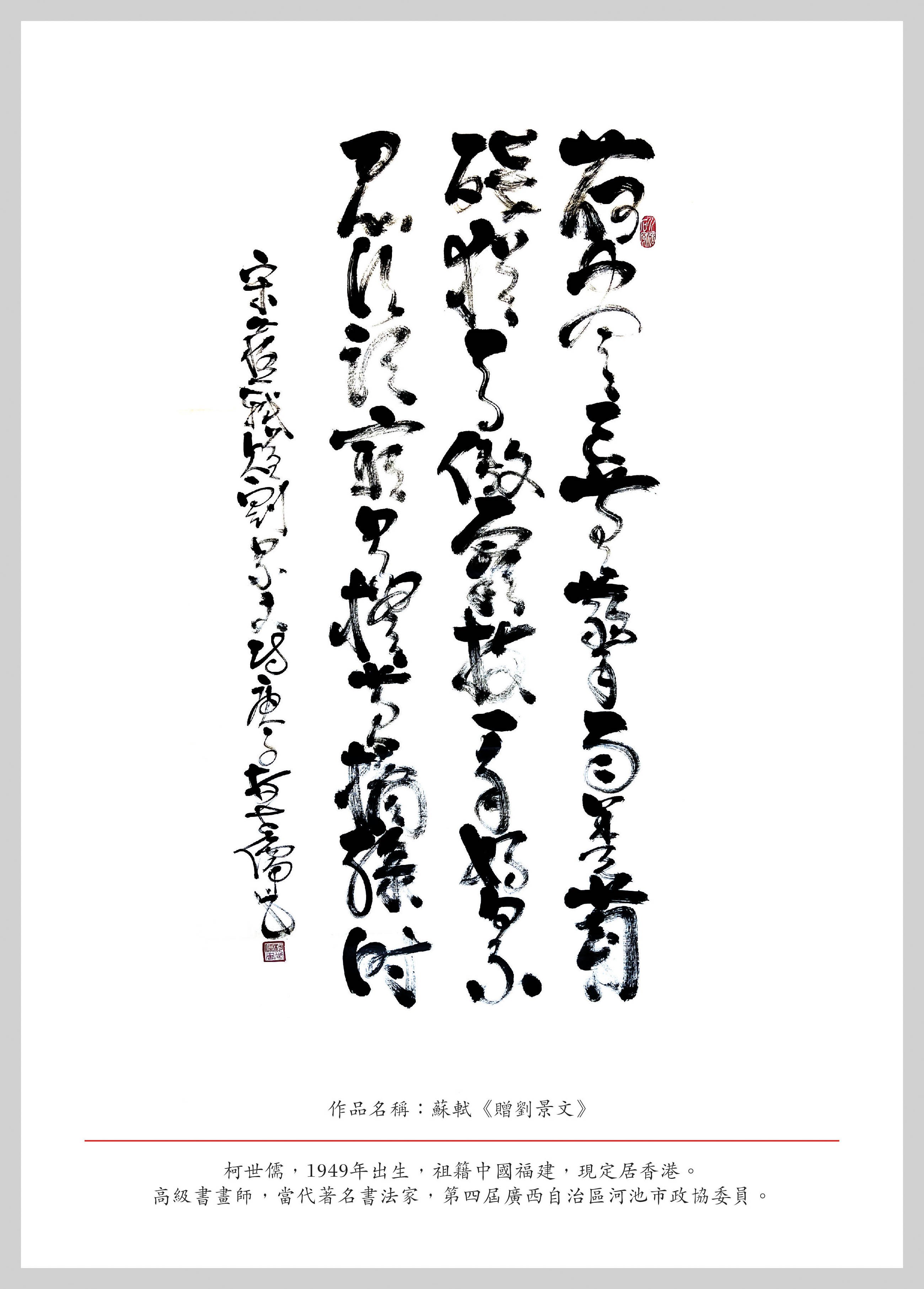 柯世儒,1949年10月出生,祖籍中国福建,长期定居香港。现任国际书画收藏家艺术交流协会秘书长、亚洲书法家协会理事、高级书法师,第四届广西自治区河池市政协委员。