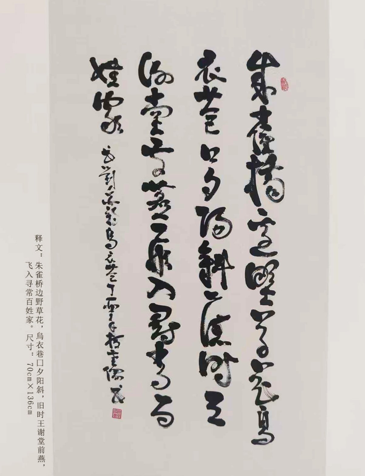 这种“形神兼追”的自觉,让他跳出了“书奴”的窠臼。在书写《乌衣巷》时,“旧时王谢堂前燕”的结体取法王羲之的欹侧,却以“布局开张”打破晋人的内敛——字与字之间牵丝映带如流云绕树,行与行之间疏密错落似山涧叠石,既守着“章法井然”的传统底线,又透着“别有韵致”的现代审美。正如他所言:“学古人不但重其形,更重其神韵与内容”,这份清醒,让他的笔墨始终站在“传承”的根基上生长,而非悬空的“创新”。