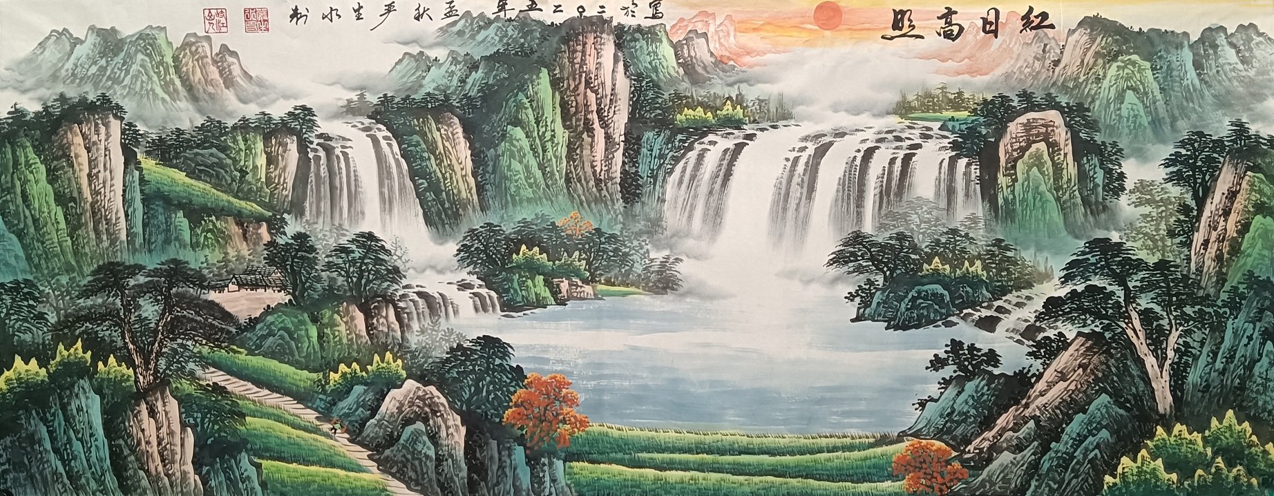 《鸿运当头》则以浓烈的暖色调打破传统山水的淡雅范式。漫山遍野的红褐与金黄,如秋阳般炽热浓烈,却因画家对色彩层次的细腻把控,丝毫不显艳俗:山石的赭红与树木的橘黄相互映衬,瀑布的留白与水面的淡蓝形成冷暖对冲,使整幅画既拥有秋日山林的绚烂热烈,又不失山水画作的悠远意境。以秋日盛景,寄寓着对生活的热忱与对未来的期许,那奔涌的瀑布、静谧的村居,是自然的节律,也是中国人“天人合一”的生命哲学。