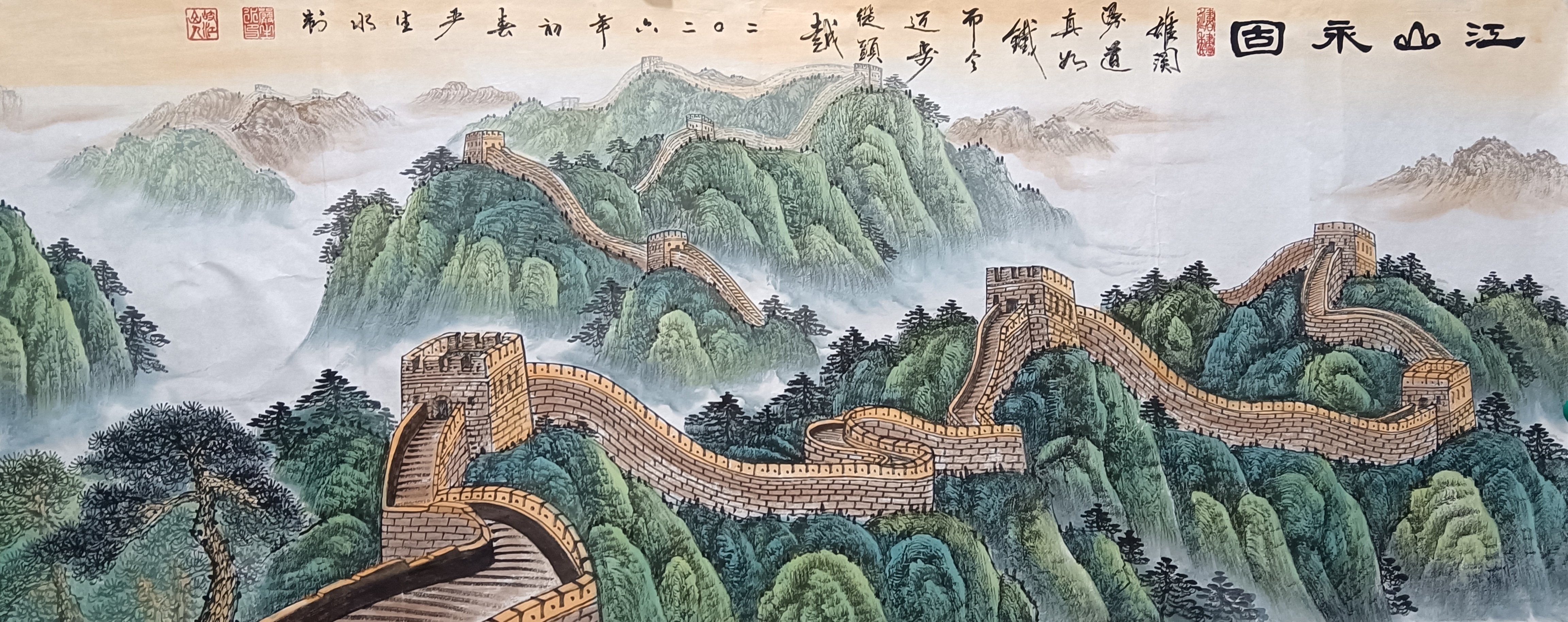 而《江山永固》里的长城,更是尽显笔力雄浑。严生水以中锋勾勒长城轮廓,线条刚劲如铁,砖石的排列、敌楼的结构皆刻画入微,仿佛能触摸到历史的温度。长城随山峦起伏蜿蜒,与云雾缭绕的青山形成刚柔对比,既还原了建筑的巍峨气势,又赋予其与自然共生的灵动气韵。设色精妙,万象入画,以青绿为主调,层层晕染的山峦,从浅绿到深青过渡自然,既保留了传统青绿山水的典雅厚重,又通过色彩的明暗变化,塑造出山川的立体感与空间感,云雾以淡墨留白,更衬出青山的温润灵秀。展现出严生水对传统与创新的精妙平衡。长城与青山的组合,无疑是“家国永安”的具象化表达,砖石间藏着历史的厚重,松涛里响着时代的强音。