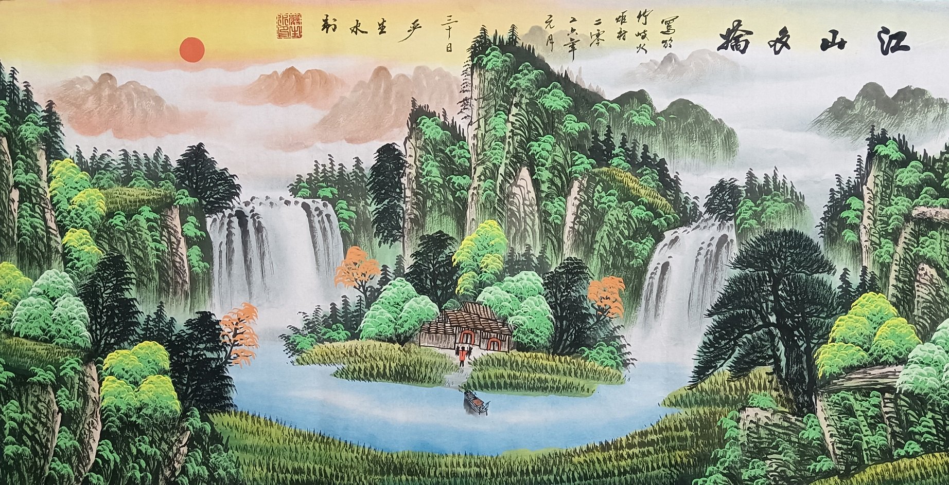 当目光落于严生水先生的山水画作,便如同踏入一场跨越四季、穿梭天地的视觉旅程。从《迎客松》的苍劲傲然,到《江山永固》的雄浑厚重,再到《鸿运当头》的热烈绚烂,每一幅作品都以精湛笔墨,勾勒出中华大地的万千气象,更将东方美学的深邃意蕴藏于尺幅之间。