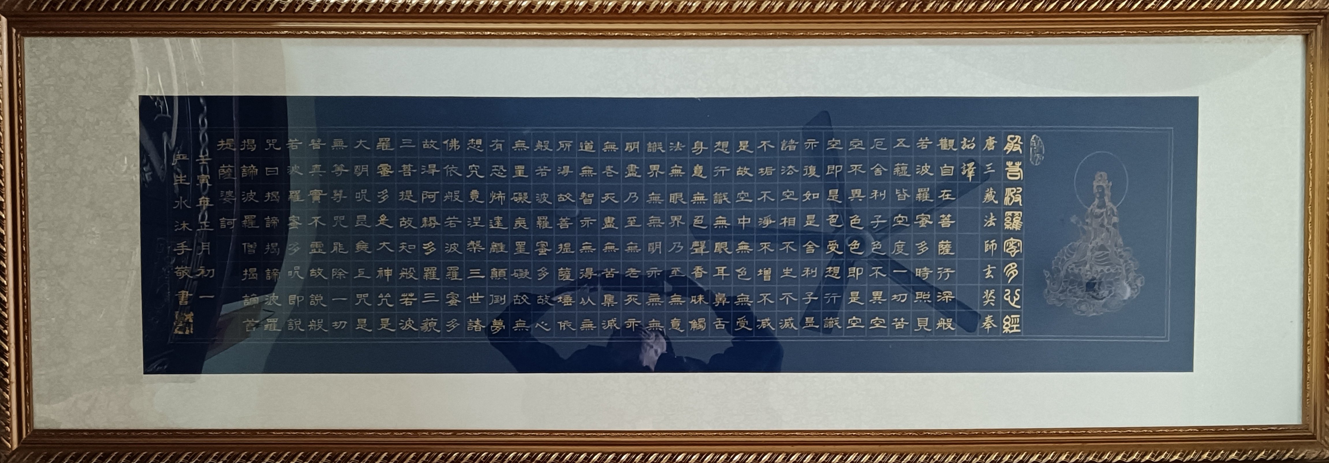 蓝底金字的《心经》,以隶书为基,兼具魏碑的方正与唐楷的法度。每一笔画都如刀刻般严谨,横平竖直间透着沉静与肃穆。金色的字在蓝色背景上,既保留了经文的神圣感,又因笔墨的质感而不失温度。严生水选择以这样克制的笔法书写心经,既是对佛教文化的敬畏,也体现了书法作为“心画”的本质——在一笔一划的专注中,实现自我的观照与精神的修行。