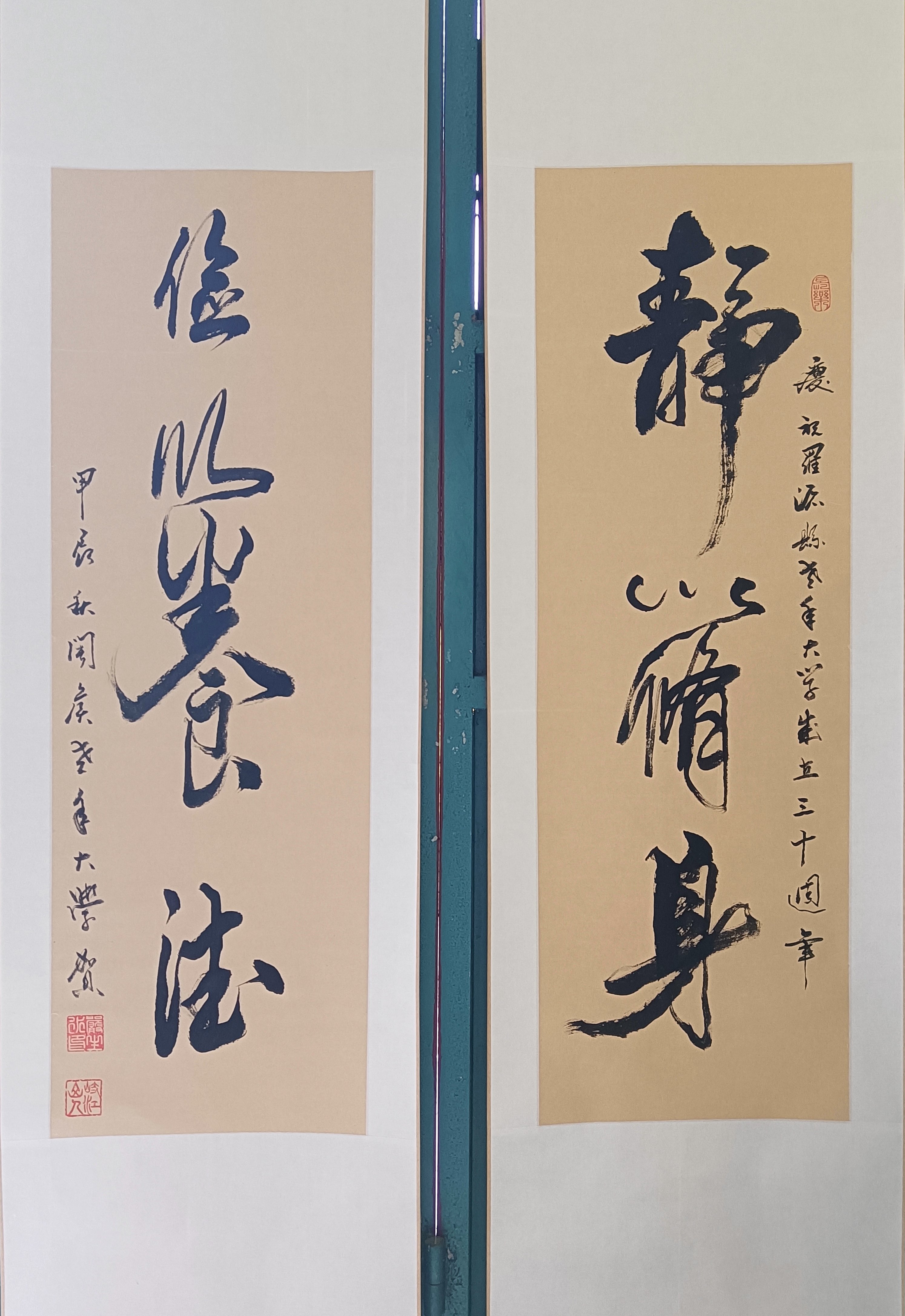 “静以修身,俭以养德”的行楷对联,则是传统文人精神的当代书写。字体端庄而不失灵动,笔画刚柔相济,既有楷书的规整,又有行书的流畅。严生水的作品作为罗源县老年大学三十周年的贺礼,更像是一种精神的传承:静与俭,既是古人的修身智慧,也成了当代老年教育的精神注脚。笔墨间的沉稳,恰是历经岁月沉淀后的从容与笃定。