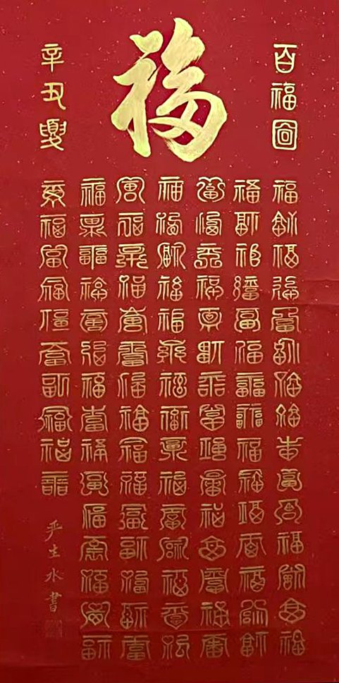 严生水的作品跳出了传统书法的“雅”之局限,主动拥抱世俗的“福”,却又以笔墨的格调避免了流俗。它让书法从案头走向生活,成为连接精神世界与世俗烟火的纽带,也体现了他对书法功能的多元理解——书法既能载道,也能传情,更能为平凡生活增添诗意。
