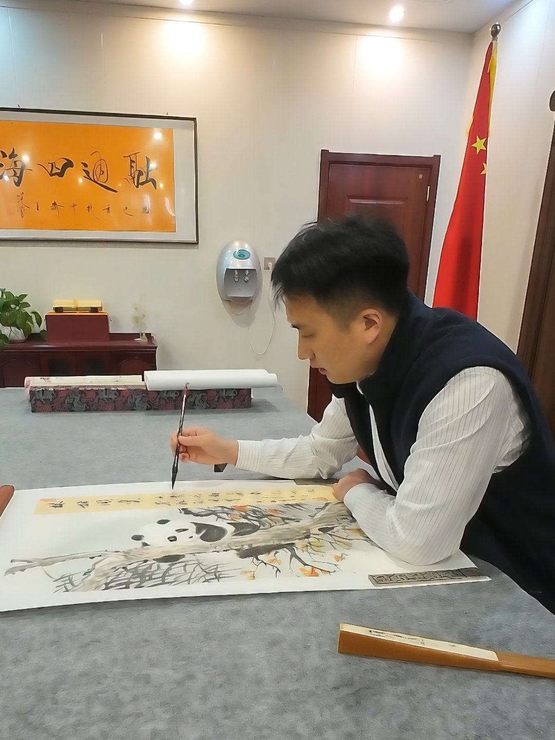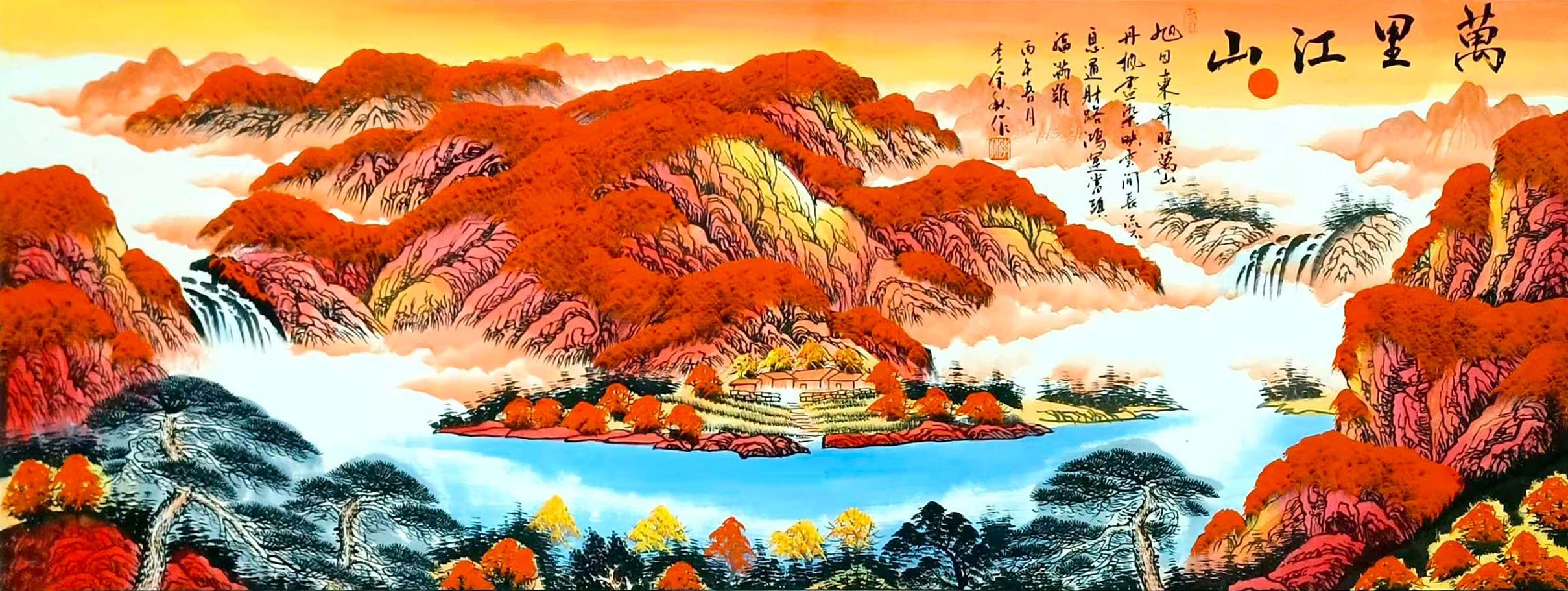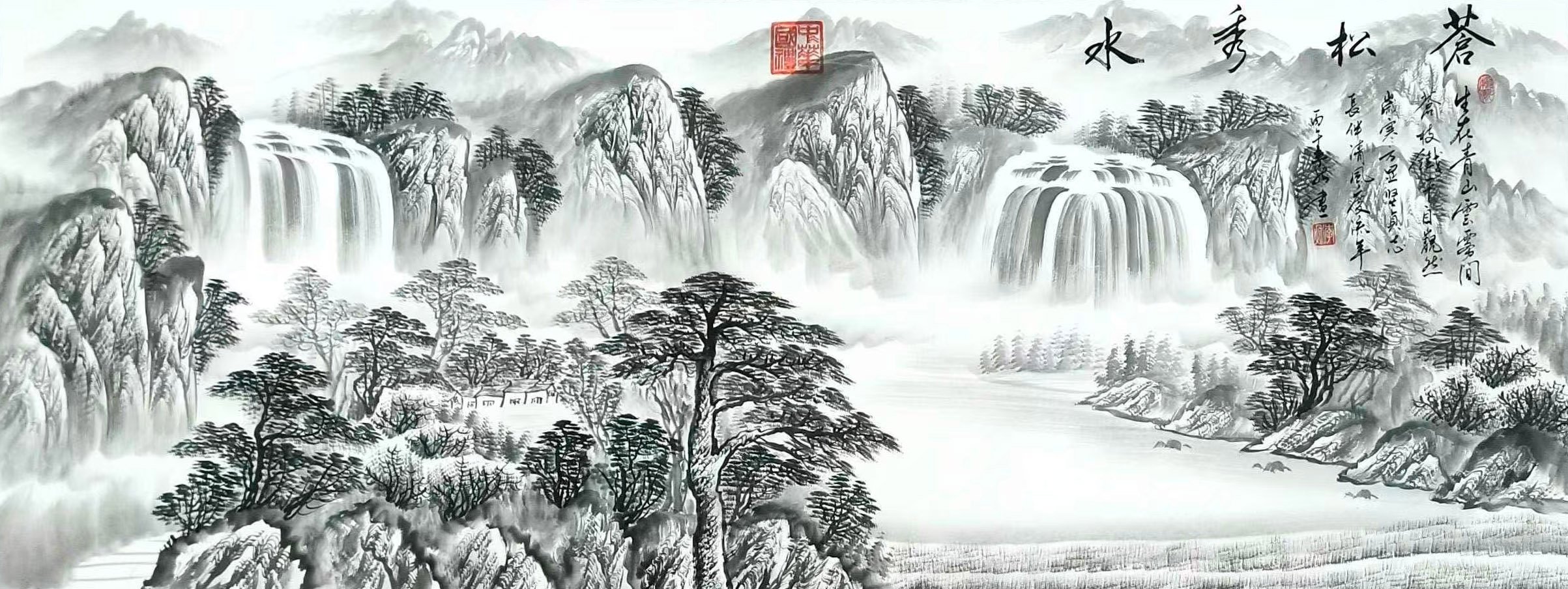 - 山水题材:《苍松秀水》《万里江山》等作品,或黑白水墨、或红韵泼彩,山水布局开合有度,瀑布飞泉、云海苍松相映成趣,兼具北方山水的雄浑与江南山水的灵秀,寓意吉祥、意境悠远,展现出深厚的传统山水功底与大气磅礴的创作格局。