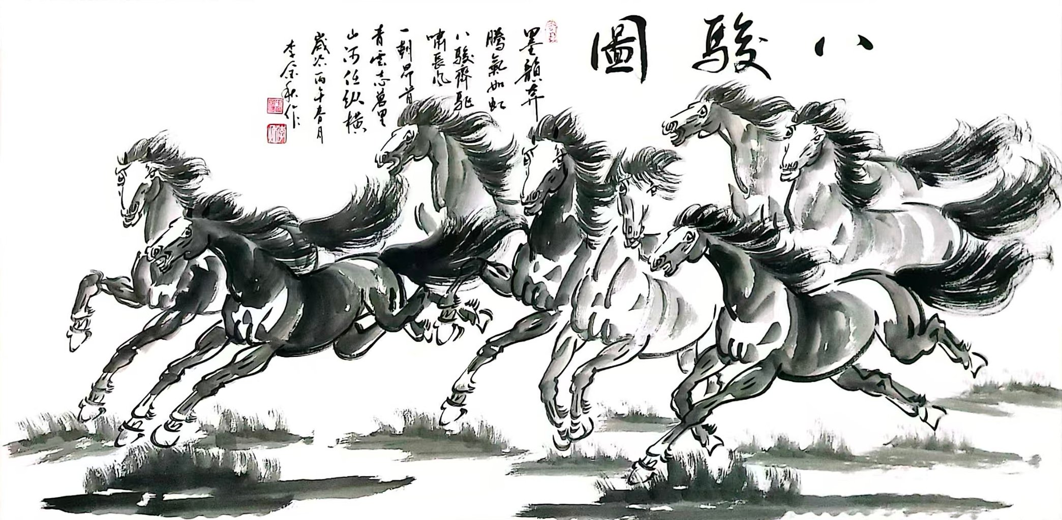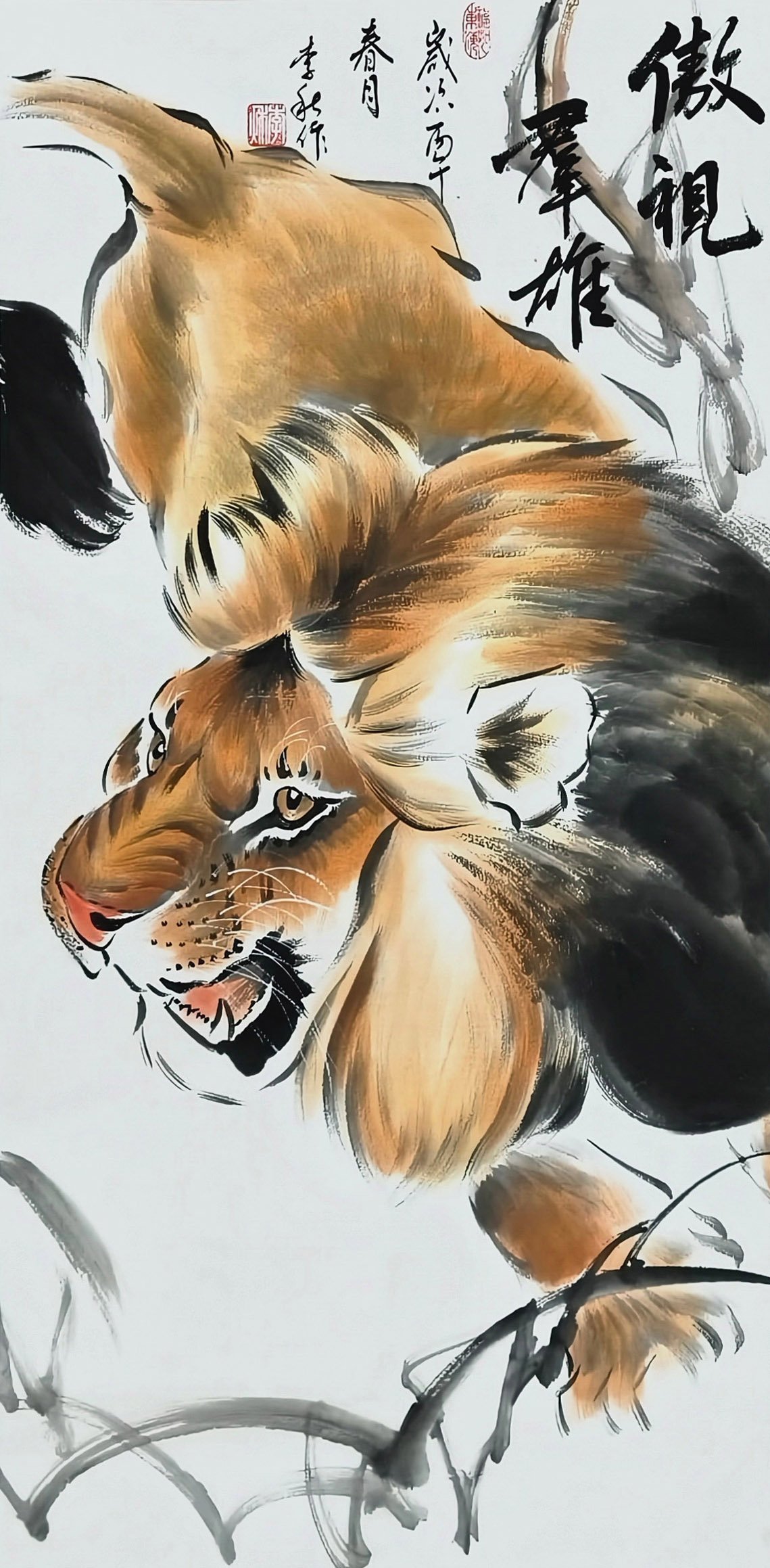 - 走兽题材:笔下的骏马、雄狮、猛虎,形神兼备、气势磅礴。《马到成功》以朱砂绘骏马,鬃毛飞扬、昂首嘶鸣,传递出昂扬向上的生命力;《八骏图》以水墨勾勒奔马,笔墨简练却动感十足,尽显万马奔腾的雄浑气象;《威虎图》中猛虎立于山岩之上,威风凛凛,尽显王者气概;《傲视群雄》则将雄狮的威严与霸气刻画得淋漓尽致。