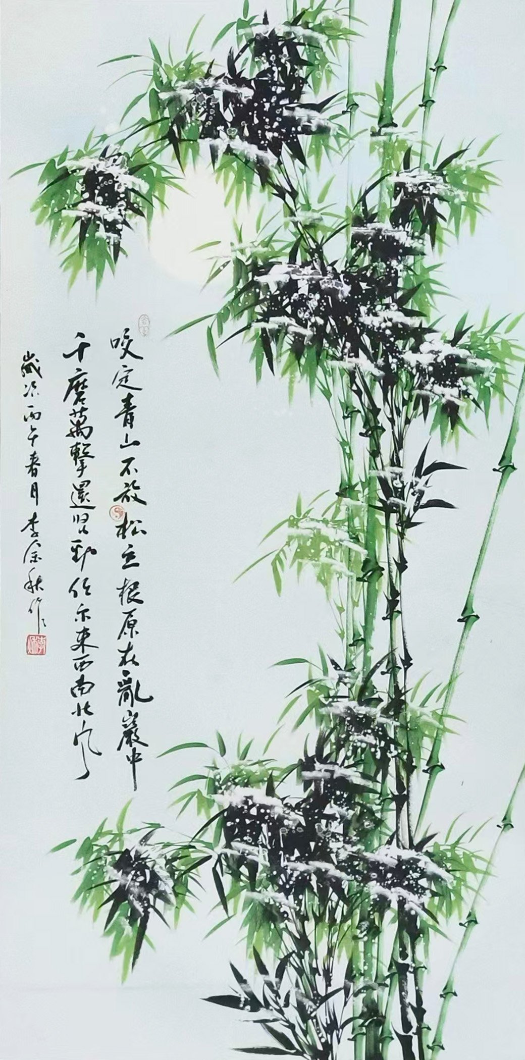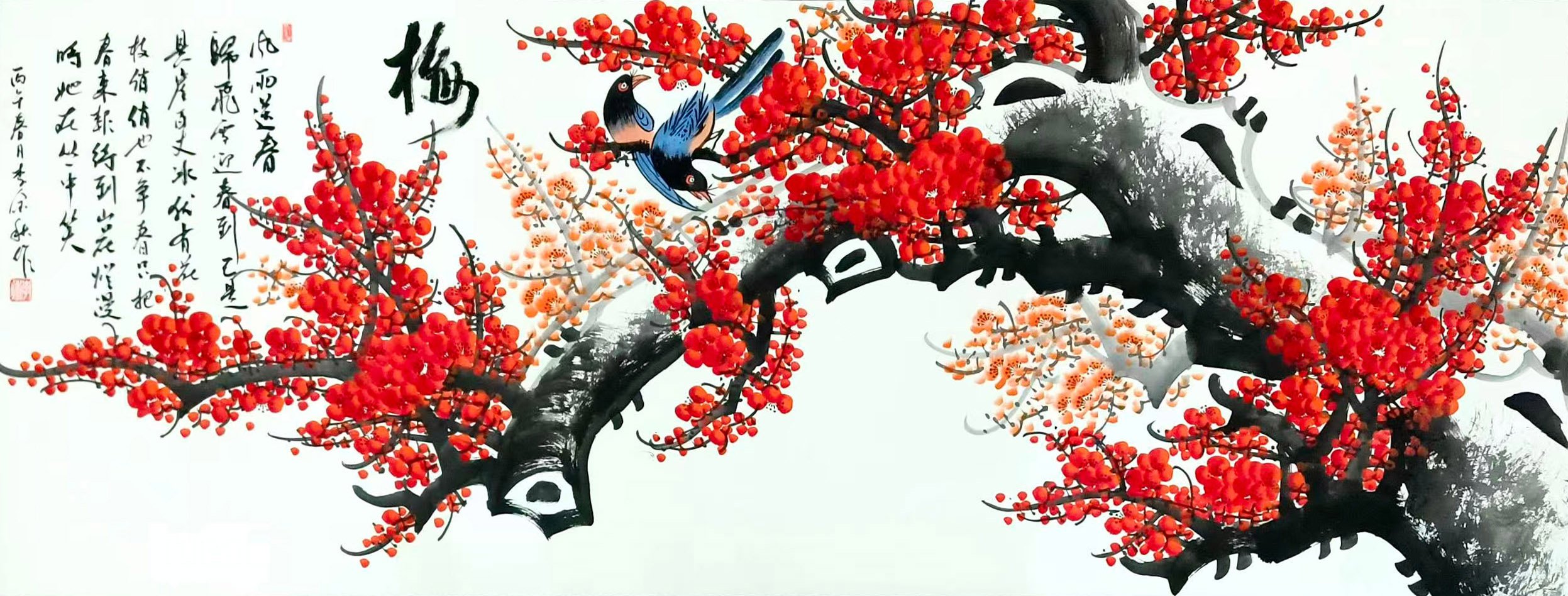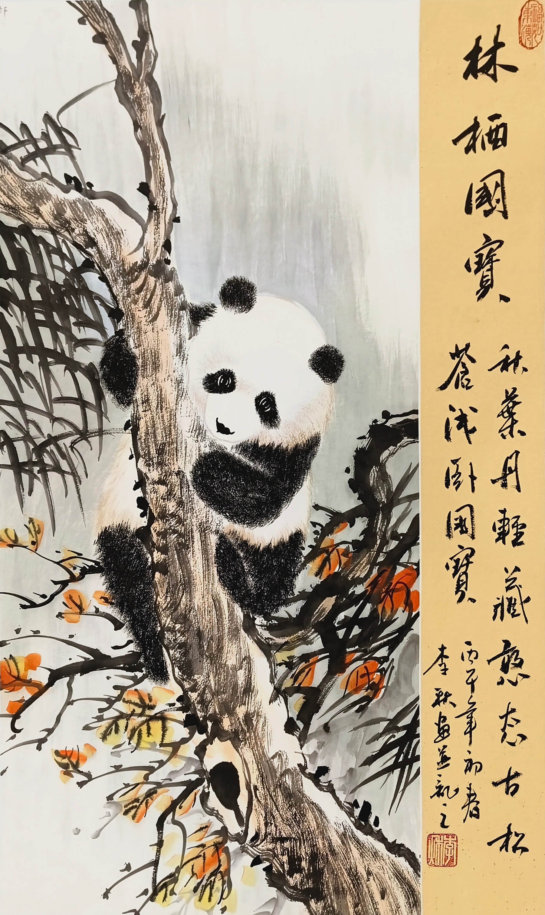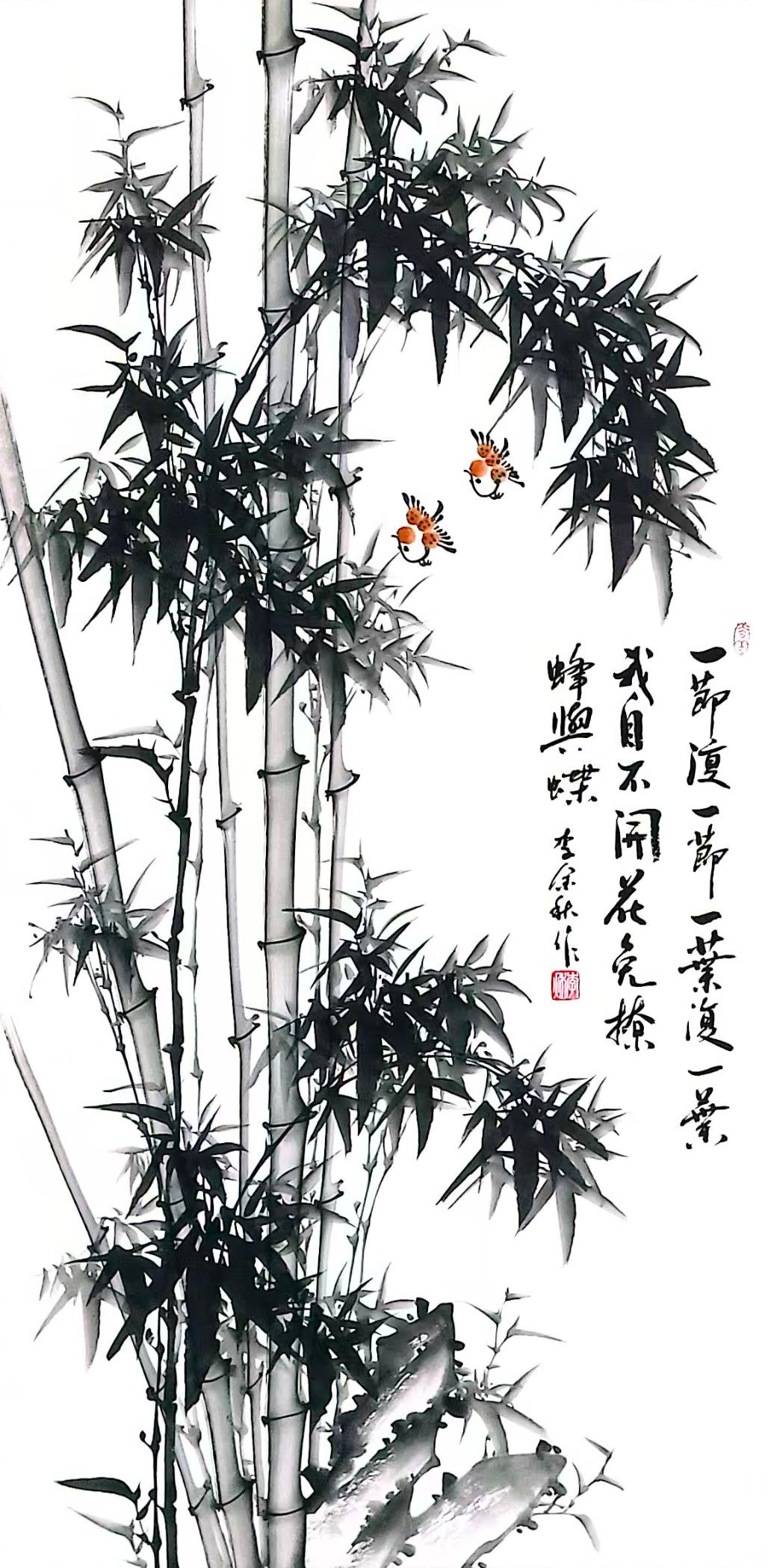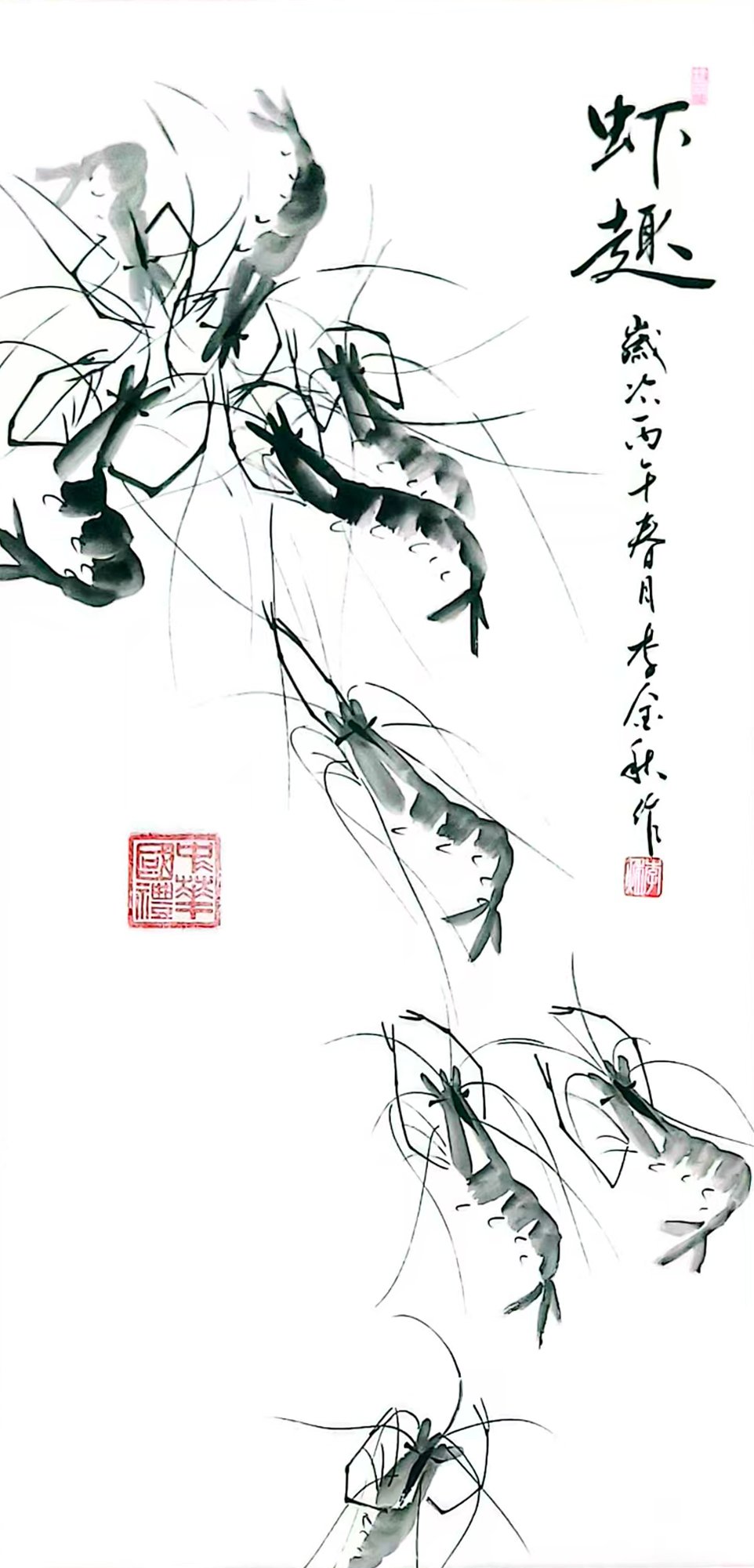 - 花鸟题材:熊猫、梅花、墨竹、虾趣等作品,或憨态可掬、或清雅高洁、或灵动传神。《林栖国宝》以淡墨绘熊猫,憨态中尽显灵秀;红梅系列作品枝干苍劲、繁花似火,传递出“梅花香自苦寒来”的风骨;《墨竹图》《雪竹图》以竹喻人,笔墨间尽显君子气节;《虾趣》则以简练水墨勾勒群虾,灵动活泼,深得齐派水墨神韵。
