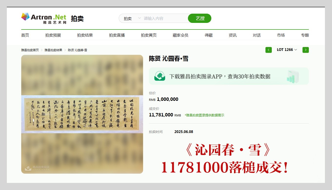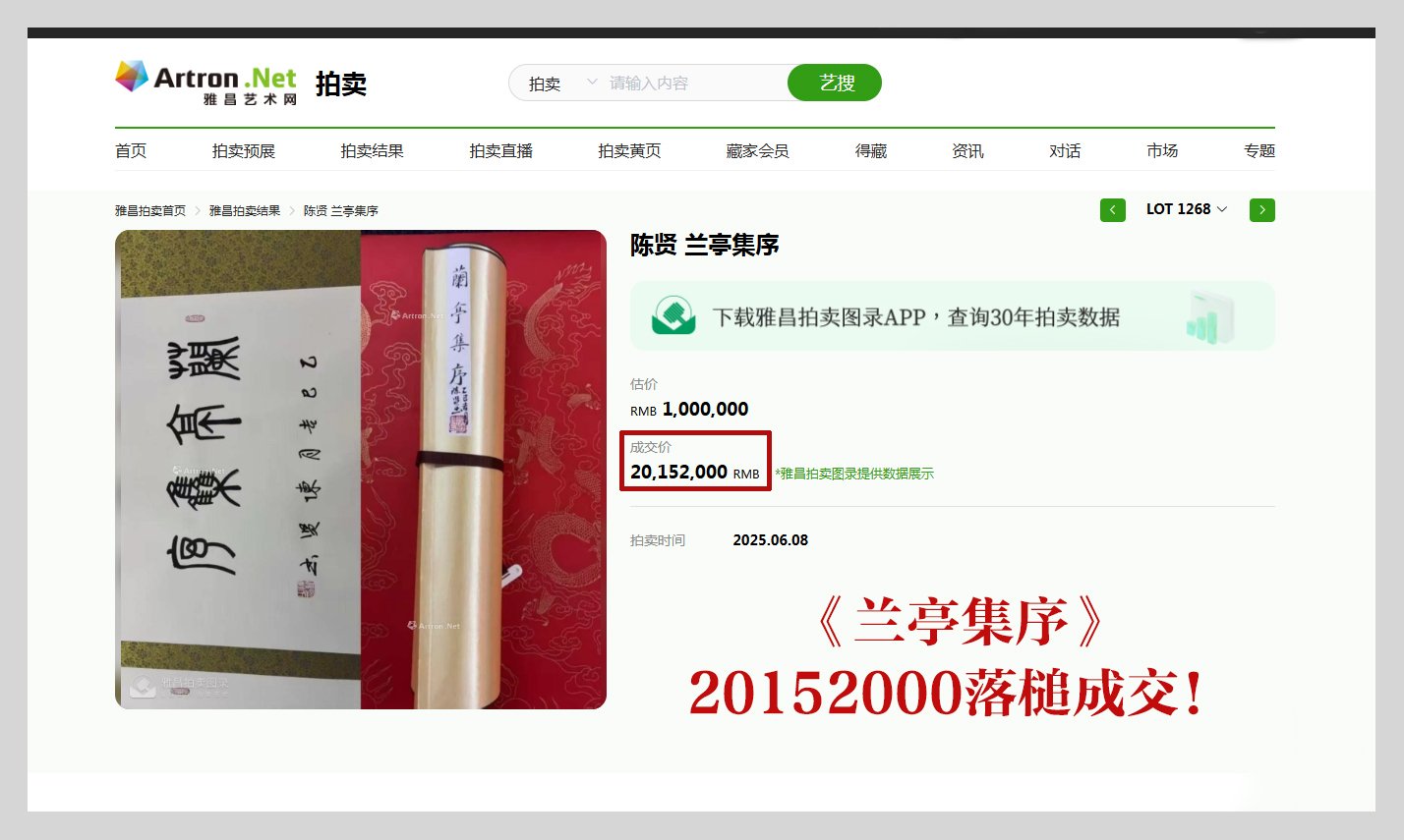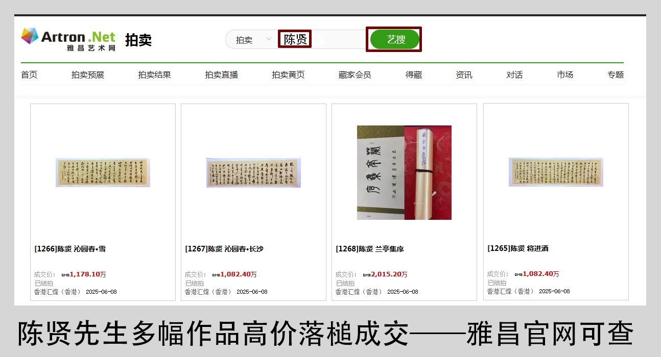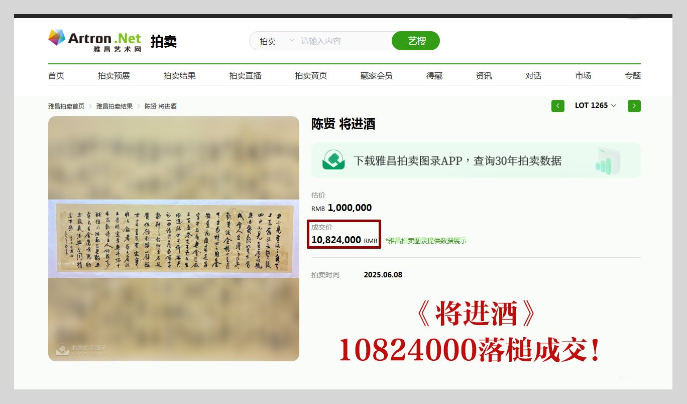 艺术市场的表现同样印证着陈贤作品的分量与价值:2014年,其经典作品《陋室铭》在嘉德春拍中,以345.5万元成交,随后被中国国家博物馆收藏,成为当年书法拍卖领域的焦点;2025年,行书力作《将进酒》凭借精湛笔法与深厚文化底蕴,以1082.4万元高价落槌,最终被清华大学美术馆纳入馆藏,再次刷新其个人作品拍卖纪录。此外,他的多件作品线上线下曝光率累计超百万次,拍卖金额屡破千万,稳定的市场表现与高收藏热度,让他的作品成为当代书法收藏领域公认的“硬通货”,也为传统书法艺术的市场价值树立了标杆。
