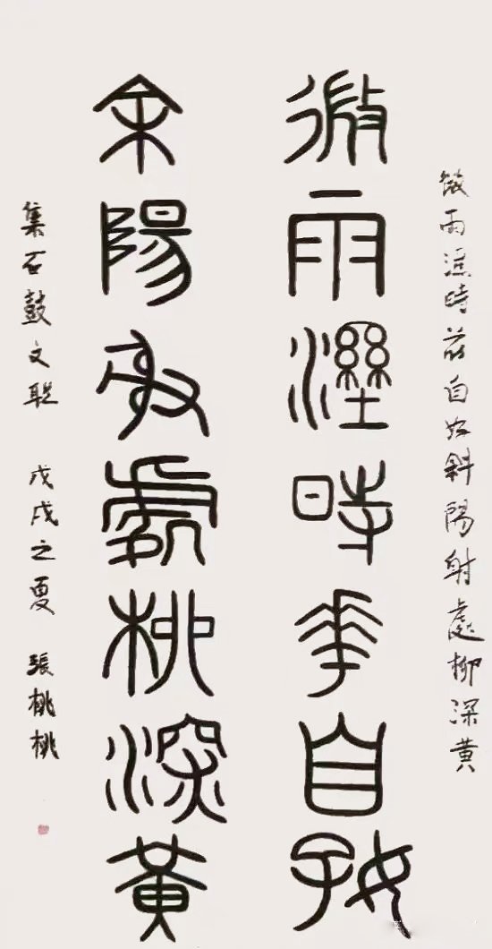 张桃桃 当代诗人 ,中华非遗文化传承人 ,对外文化友好使者,毕业于北京中医药大学。现为北京炎黄文化研究院会员、并为中国楹联学会,、中华诗词学会、中宣盛世国际书画院、世界汉语作家协会等文化机构会员。小时接触书法,被老师画红圈点评军字体一竖的正直,从此爱尚书法,多以春联趣入,之后在御生堂任中药调剂师期间,有幸研习其古医方剂及书法之美,乐于学习探讨。偶遇习书人士大康先生传承人齐君老师并跟随学习,精研临摹而习得书法作品,同期参加国开书法学院“书苑点晴”、“新书苑”两期全国榜书艺术暨师资技能书法高研班学习、作品入选期刊。后期参加中华翰墨双创教育“溯古通今”书法特训高研班学习,常随师持续进行送艺术下乡,精神文明建设走进群众公益文化宣传的普惠活动。有书法作品入选兰亭书法网举办“兰亭书展”荣获证书,经中国文化遗产保护研究院文学书画艺术院授予“中国人民文艺家”称号。在中宣盛世国际书画院举办“盛世风采.艺术中国”暨全国实力派艺术名家活动中,其作品入选“会国优秀名家扑克艺术名品雅集”。应邀参加第十九届中国世际大采风活动年度总结表彰大会暨CC丅V智慧中国栏目电视人物版奖盛典获“中国当代德艺双馨艺术家”荣誉称号。在第九届传统文化传承与发展大会暨榜样力量2024新闻人物年度盛典中,获“2024中华文华年度新闻人物”称号,诗词作品入选《流芳中国.群英谱》官刊。