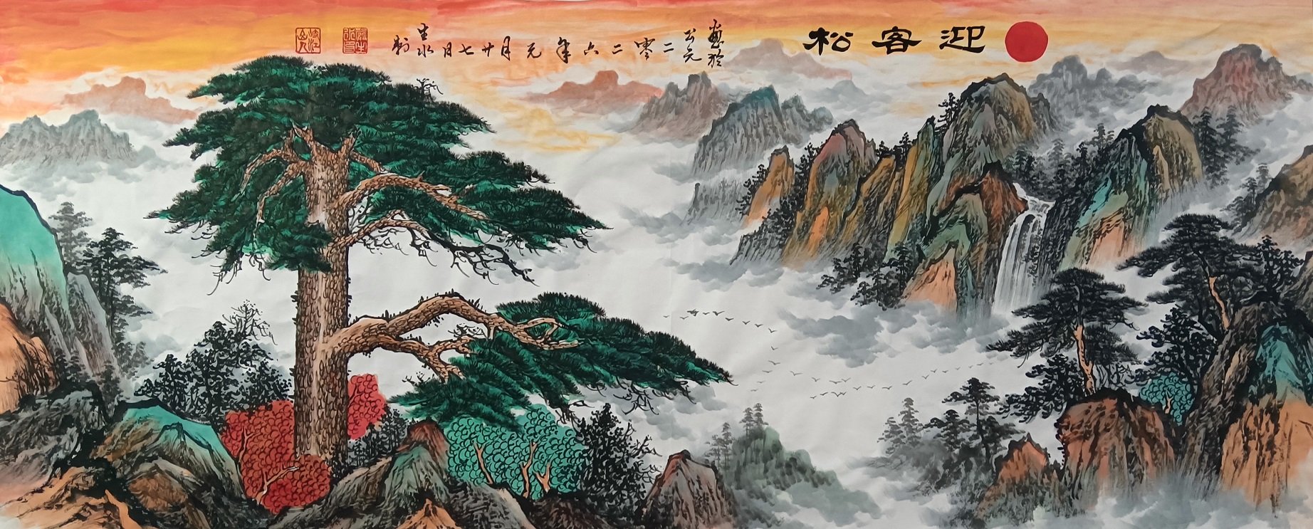 以形写神,笔底藏丘壑。严生水先生的画作,首先折服观者的是其对自然形态的精准捕捉与艺术化重塑。比如《迎客松》中,那棵扎根于云海之畔的古松堪称点睛之笔:皴擦细腻的树皮纹理,似在诉说百年风霜;如盖的墨绿松针,以浓淡层次区分向背,兼具苍劲质感与灵动姿态;枝干舒展的弧度,恰如张开的臂膀,将“迎客”的好客之道与坚韧品格融于一体。云海翻腾的群山、振翅翱翔的飞鸟,与迎客松共同构建出开阔辽远的意境,既是对中华大地壮美山河的礼赞,也传递出开放包容、海纳百川的民族气度。