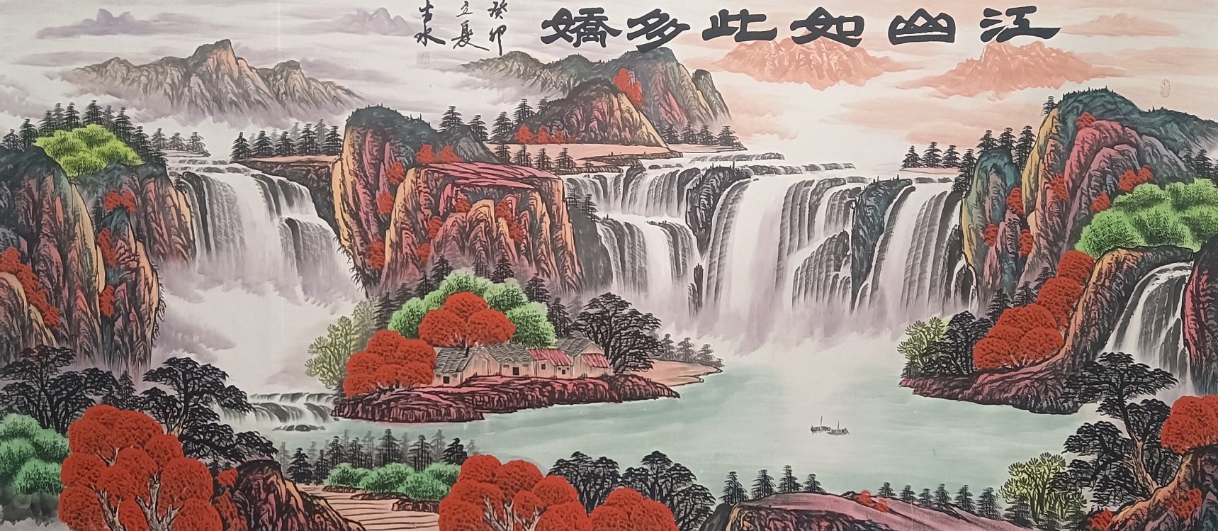 当目光落于严生水先生的山水画作,便如同踏入一场跨越四季、穿梭天地的视觉旅程。从《迎客松》的苍劲傲然,到《江山永固》的雄浑厚重,再到《鸿运当头》的热烈绚烂,每一幅作品都以精湛笔墨,勾勒出中华大地的万千气象,更将东方美学的深邃意蕴藏于尺幅之间。