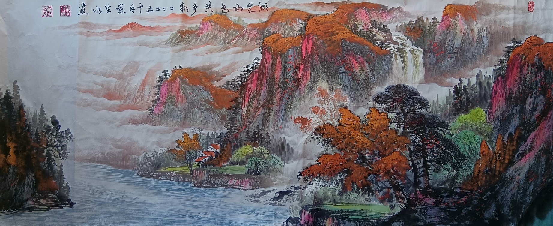《鸿运当头》则以浓烈的暖色调打破传统山水的淡雅范式。漫山遍野的红褐与金黄,如秋阳般炽热浓烈,却因画家对色彩层次的细腻把控,丝毫不显艳俗:山石的赭红与树木的橘黄相互映衬,瀑布的留白与水面的淡蓝形成冷暖对冲,使整幅画既拥有秋日山林的绚烂热烈,又不失山水画作的悠远意境。以秋日盛景,寄寓着对生活的热忱与对未来的期许,那奔涌的瀑布、静谧的村居,是自然的节律,也是中国人“天人合一”的生命哲学。